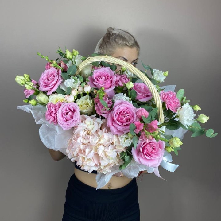 Садовая корзина — главный тренд последних лет. Свободная многовидовая аранжировка в плетёной корзине: эустома, ранункули, нигелла, зелень — ощущение только что срезанных цветов из загородного сада. Покупают те, кто устал от строгих классических форматов и ищет природной органики и лёгкости в подарке.
