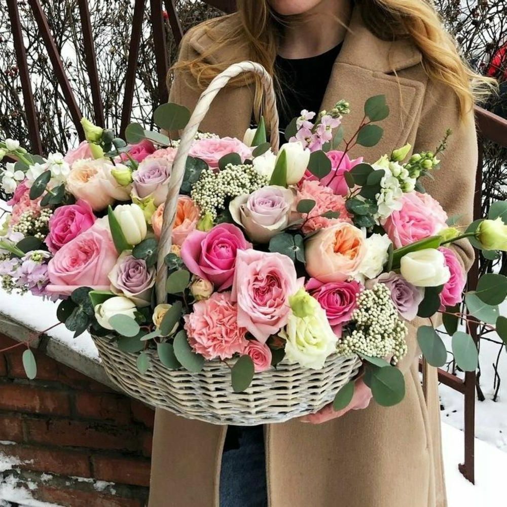Плотная россыпь бутонов в плетеной корзине создает живописную композицию с переходами от сиреневых до пудровых оттенков. Гортензия и маттиола задают воздушный объем, а розы разной раскрытости добавляют глубину и многослойность всей картине.