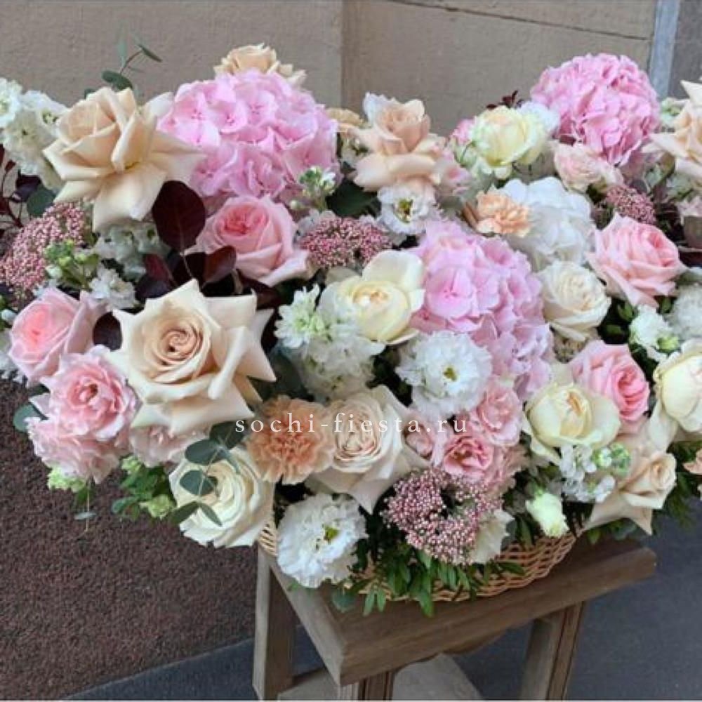 розы, эустома, гортензия, бомбастик, маттиола ( или аналог), эвкалипт, корзина.