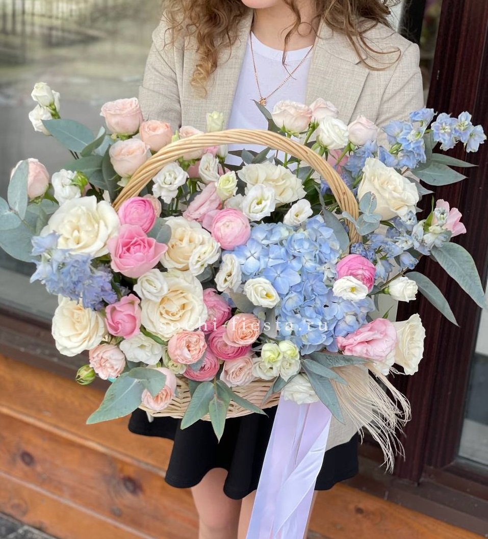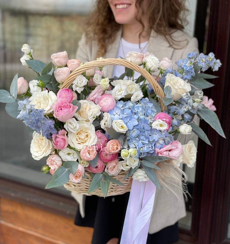 Двадцать пять французских роз в корзине создают плавный переход от светлых розовых тонов к насыщенной фуксии. Эвкалипт добавляет свежести и завершает композицию естественной зеленью. Букет удобно разместить на столе или комоде благодаря устойчивой корзине.
