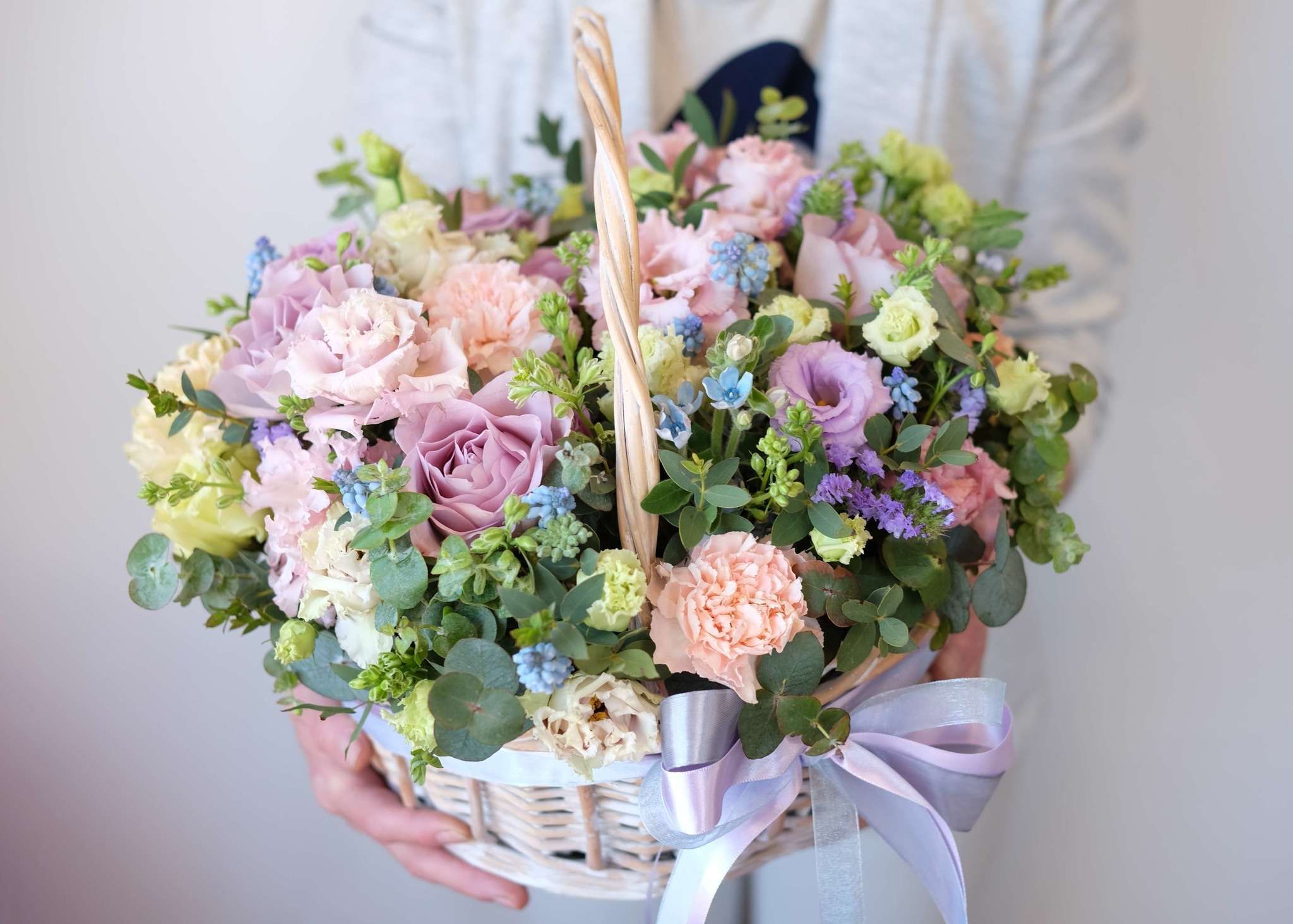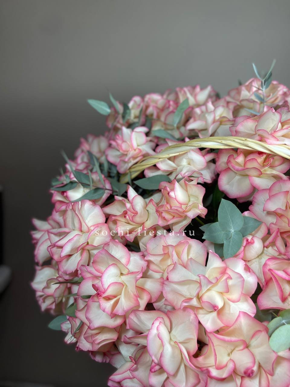 Плотная сферическая форма из пышных бутонов создаёт объёмную композицию в плетёной корзине. Ветки эвкалипта добавляют воздушности между головками цветов. Классическое решение для яркого события или знакового дня в жизни близкого человека.