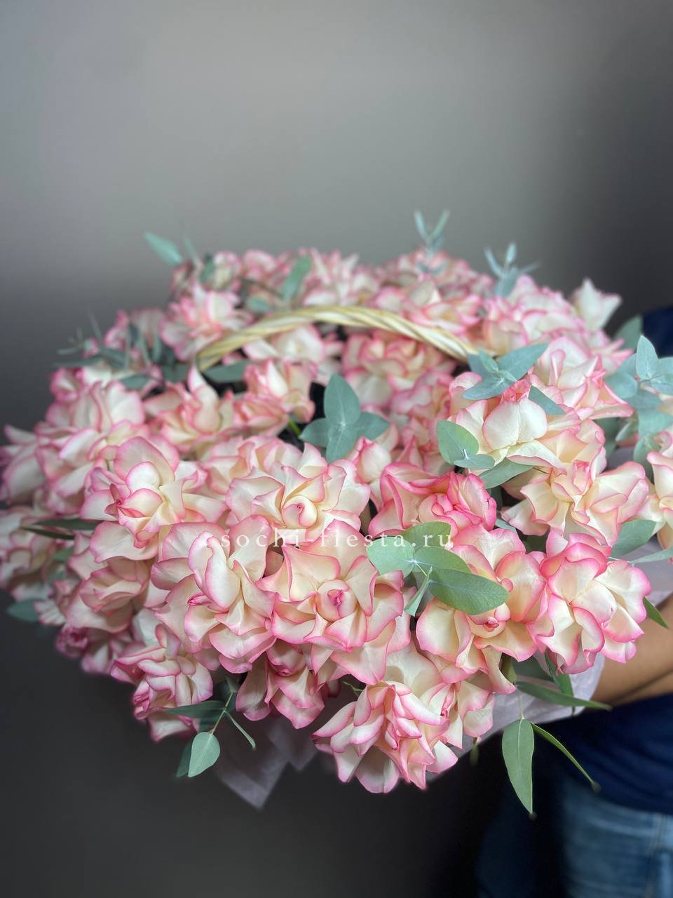 роза  французские - 25шт, эвкалипт, корзина.