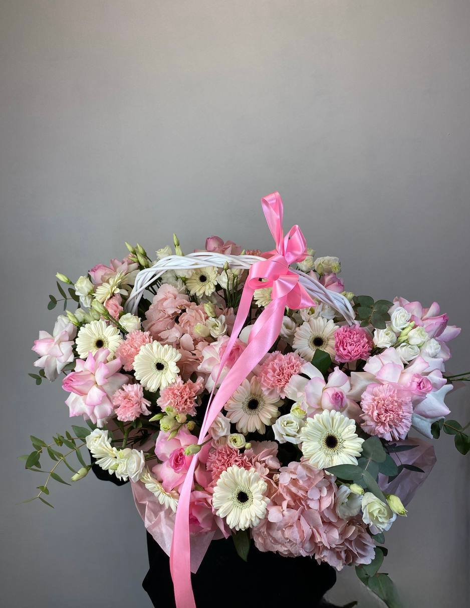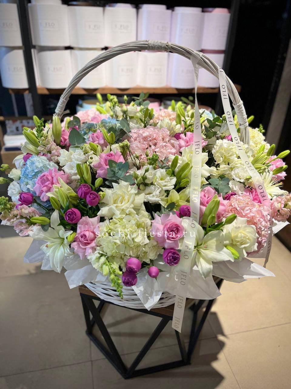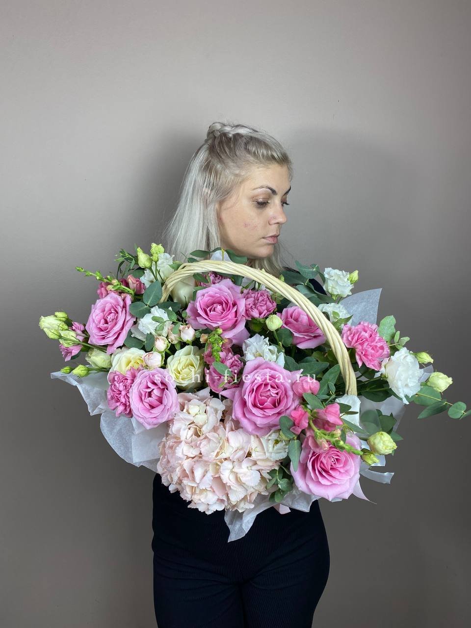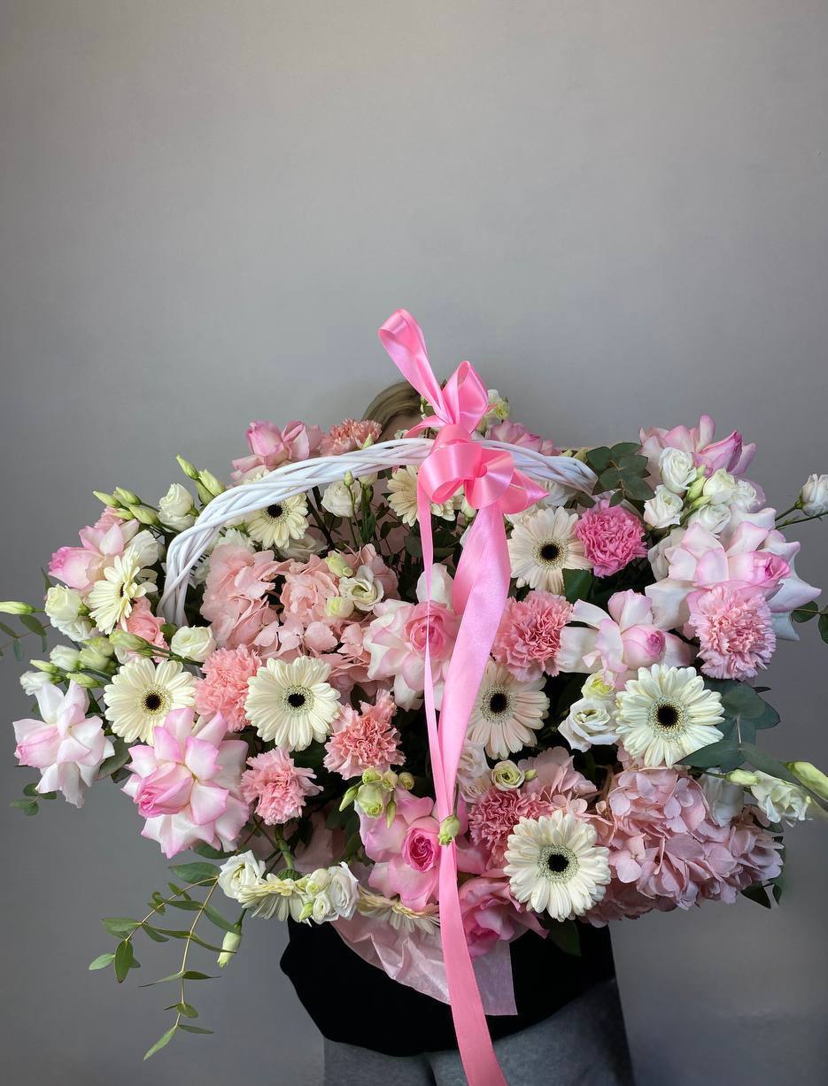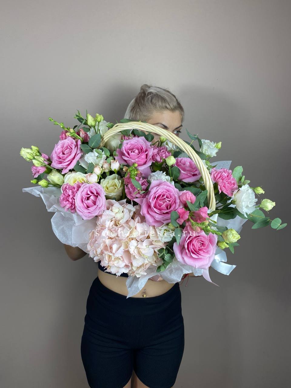 Плетёная корзина вмещает густую композицию из белых и розовых бутонов. Хризантемы и розы перемежаются с соцветиями гортензии, а статица добавляет воздушности между крупными головками цветов.