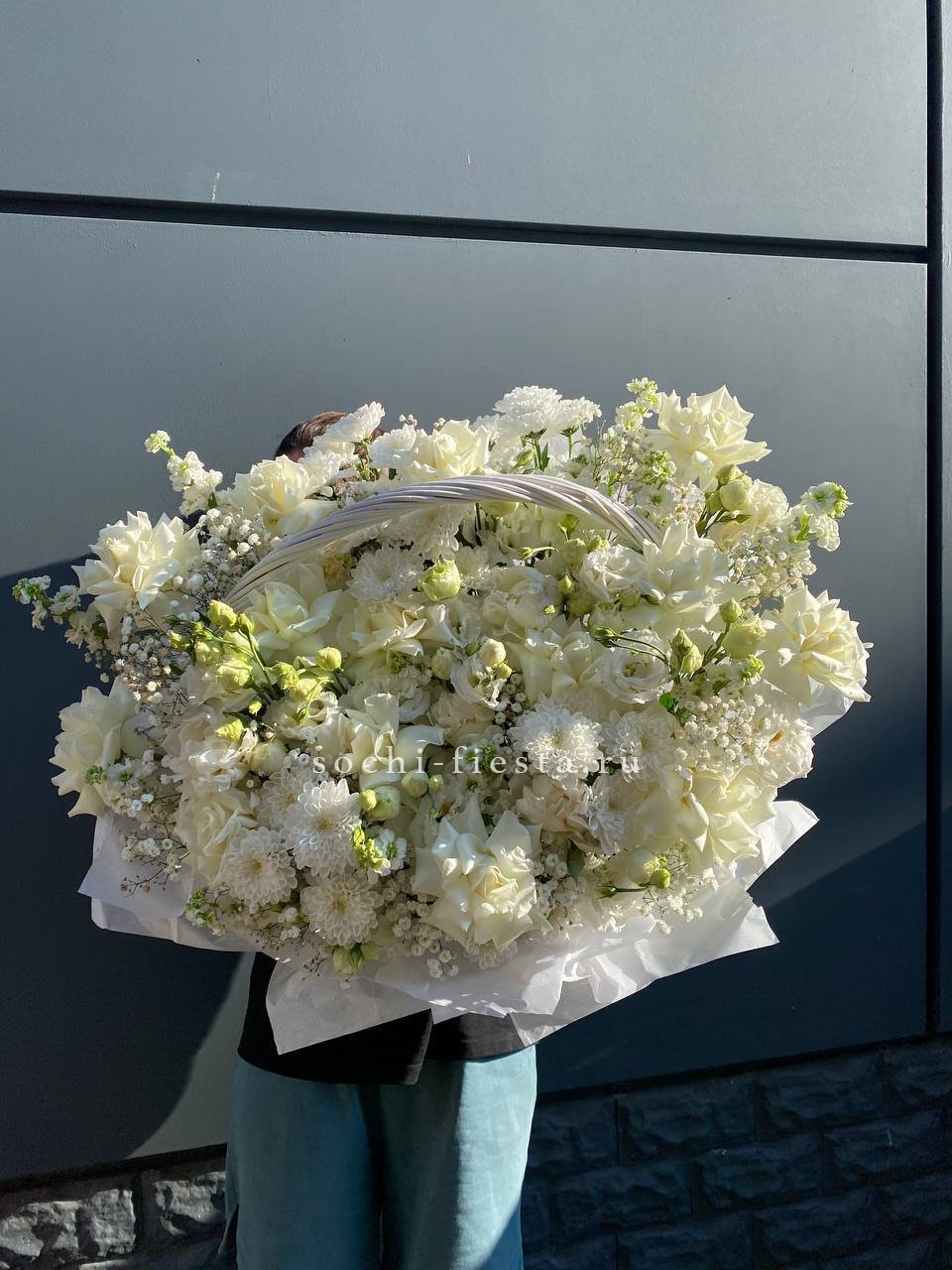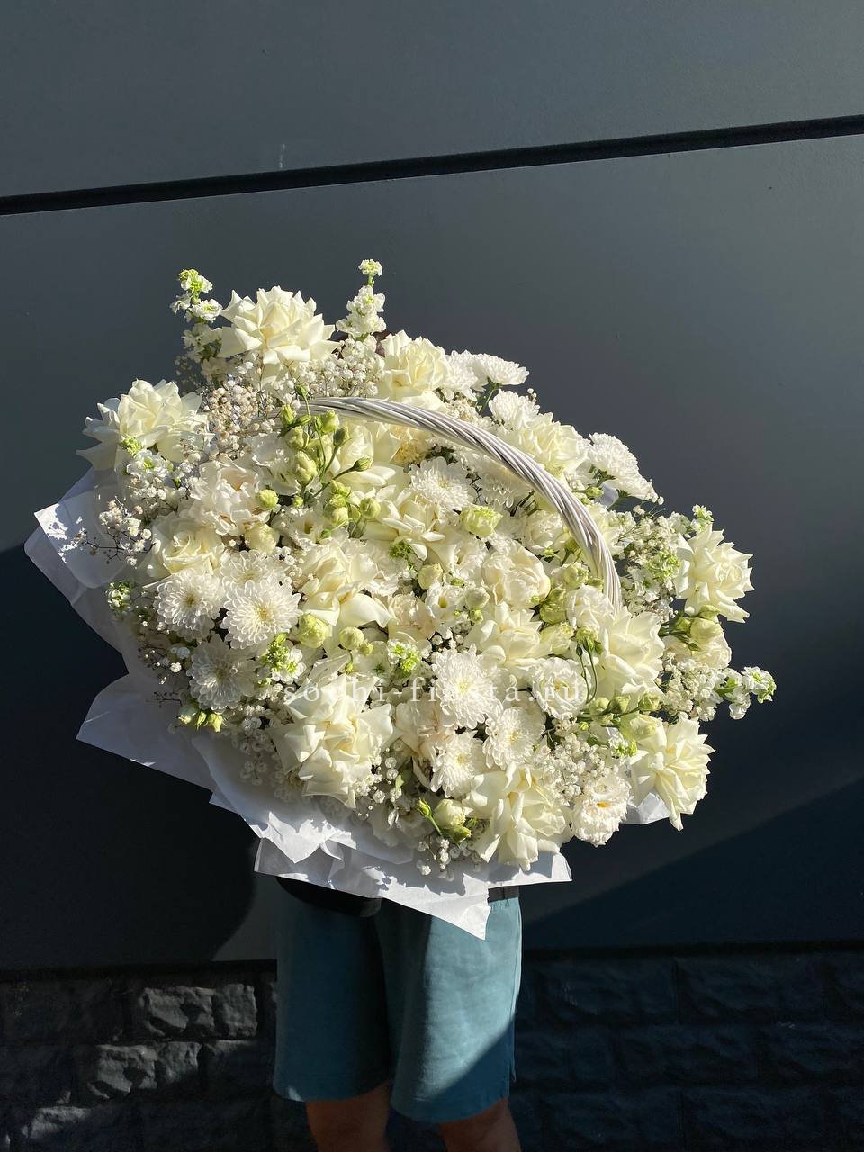 Белые розы и эустома образуют воздушную композицию с мягкими переходами между соцветиями. Хризантемы и маттиола добавляют объема, а гипсофила создает легкую дымку по краям. Корзина выглядит свежо и собранно в любом пространстве.