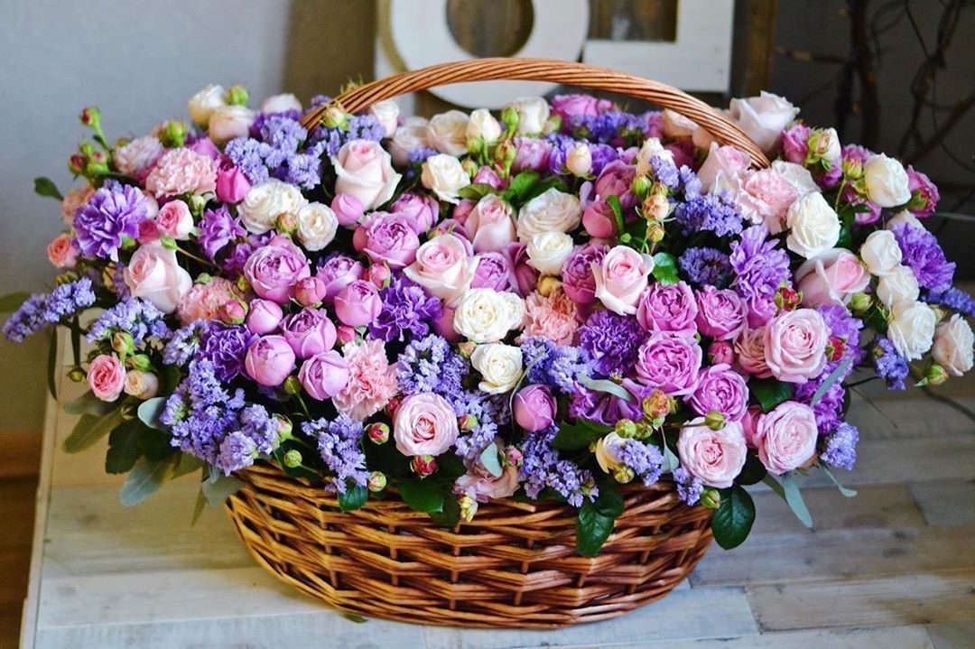 Пышные пионовидные розы Мисти Баблс и бомбастик создают объёмное облако в естественной плетёной корзине. Диантусы и статица добавляют воздушности, а эвкалипт завершает композицию свежими нотами. Яркое присутствие в любом пространстве.