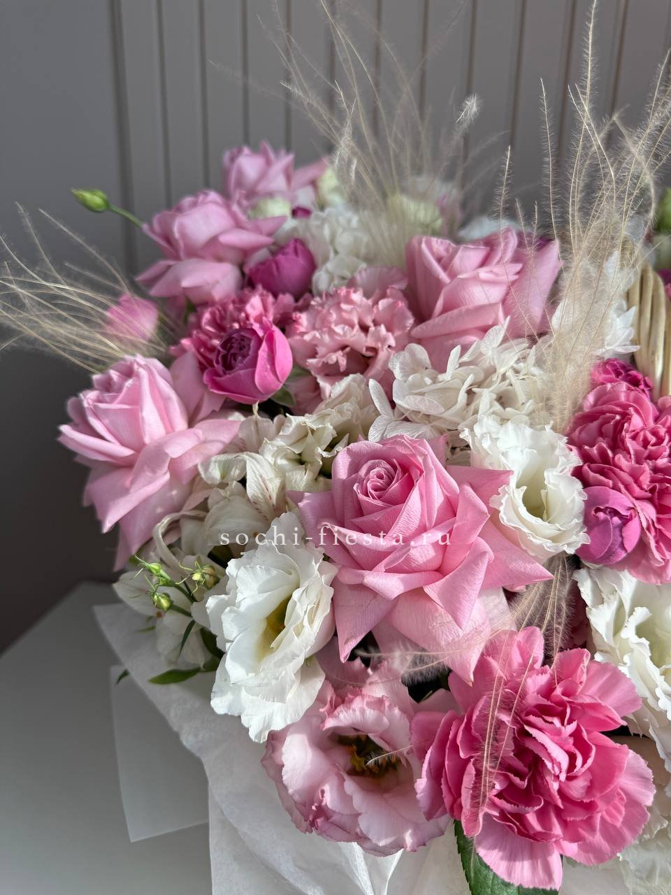 Пионовидные розы задают объём, а маттиола и эустома создают воздушную дымку вокруг центральных бутонов. Диантусы добавляют точечные акценты между крупными соцветиями.