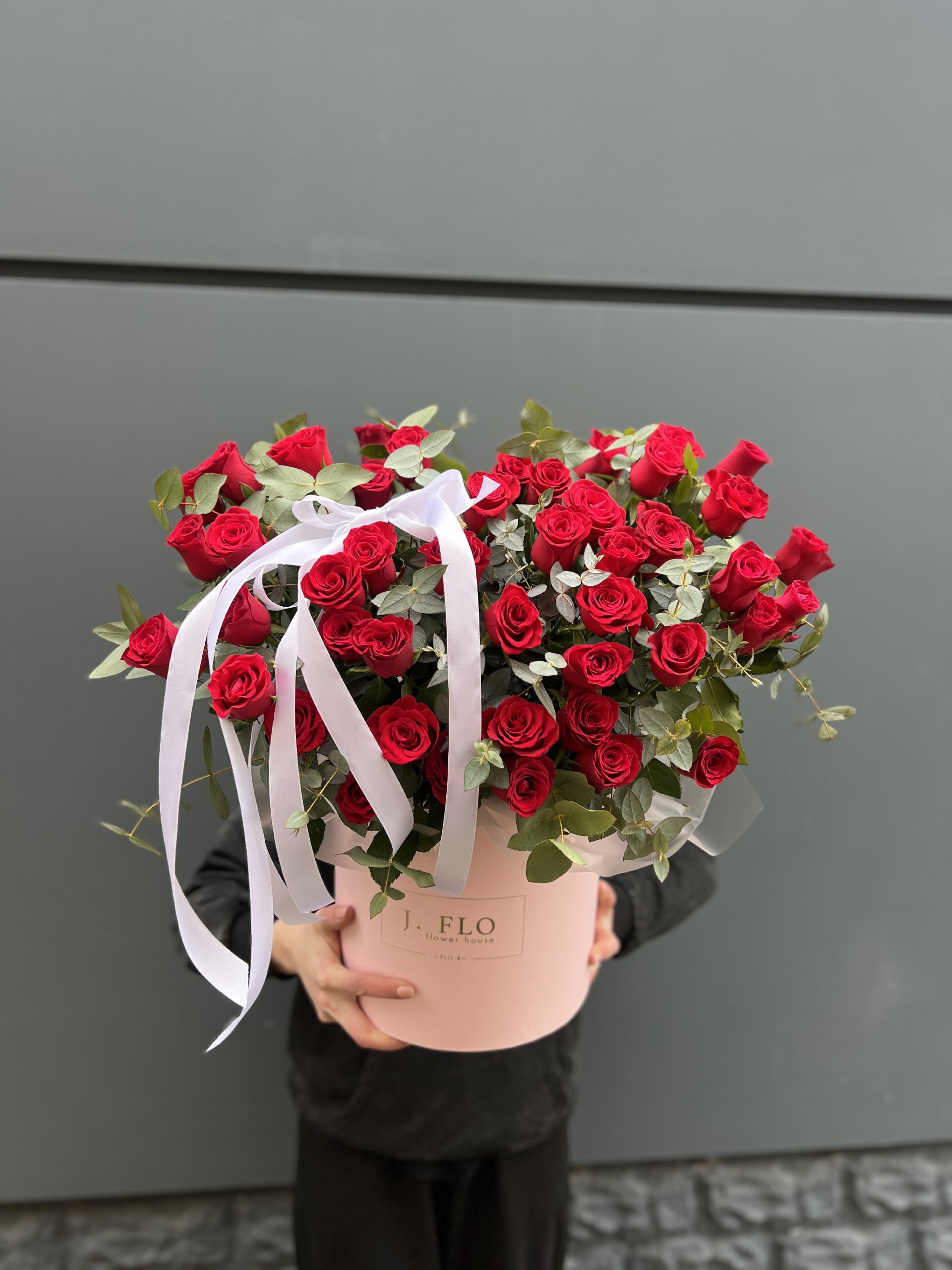 Сорок пять красных роз в высоком цилиндре создают впечатляющее присутствие. Плотная сборка держит форму, эвкалипт добавляет зелени по краю.
