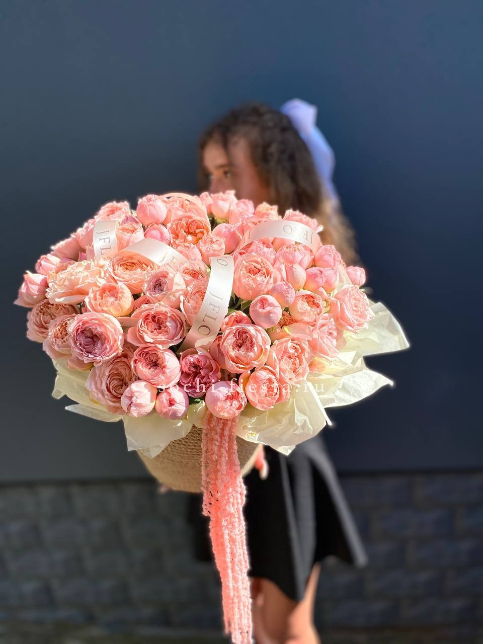 Пионовидные кустовые розы Джульетта с их густомахровыми бутонами создают объемную текстуру. Каждый цветок раскрывается слоями, формируя плотную и выразительную композицию в джутовом кашпо.
