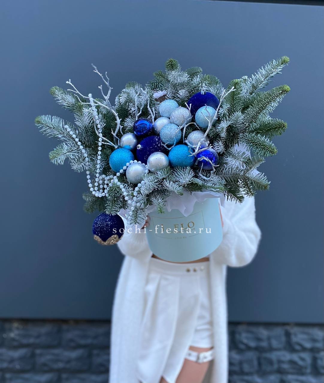 Холодные оттенки игрушек и декора переплетаются с насыщенной зеленью нобилиса. Композиция построена на игре глубоких и светлых тонов без лишней пестроты. Цилиндр задает четкую геометрию всей конструкции.