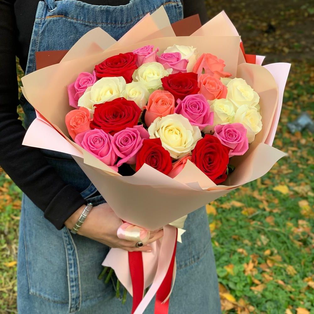 101 роза разноцветных оттенков, лента, упаковка на выбор.