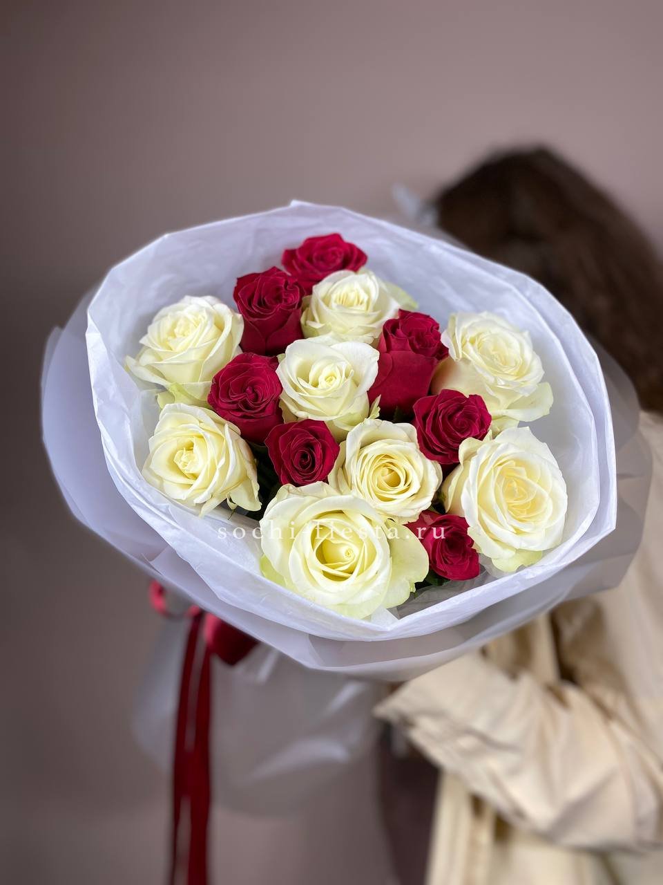 белые и красные розы микс в нежном оформлении.