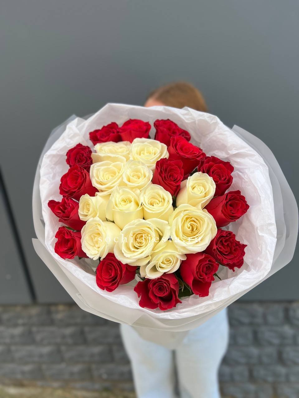 Белые и красные розы переплетаются в динамичной игре света и тени. Двадцать семь бутонов создают живописный рисунок, где каждый цвет усиливает звучание другого без лишних слов.