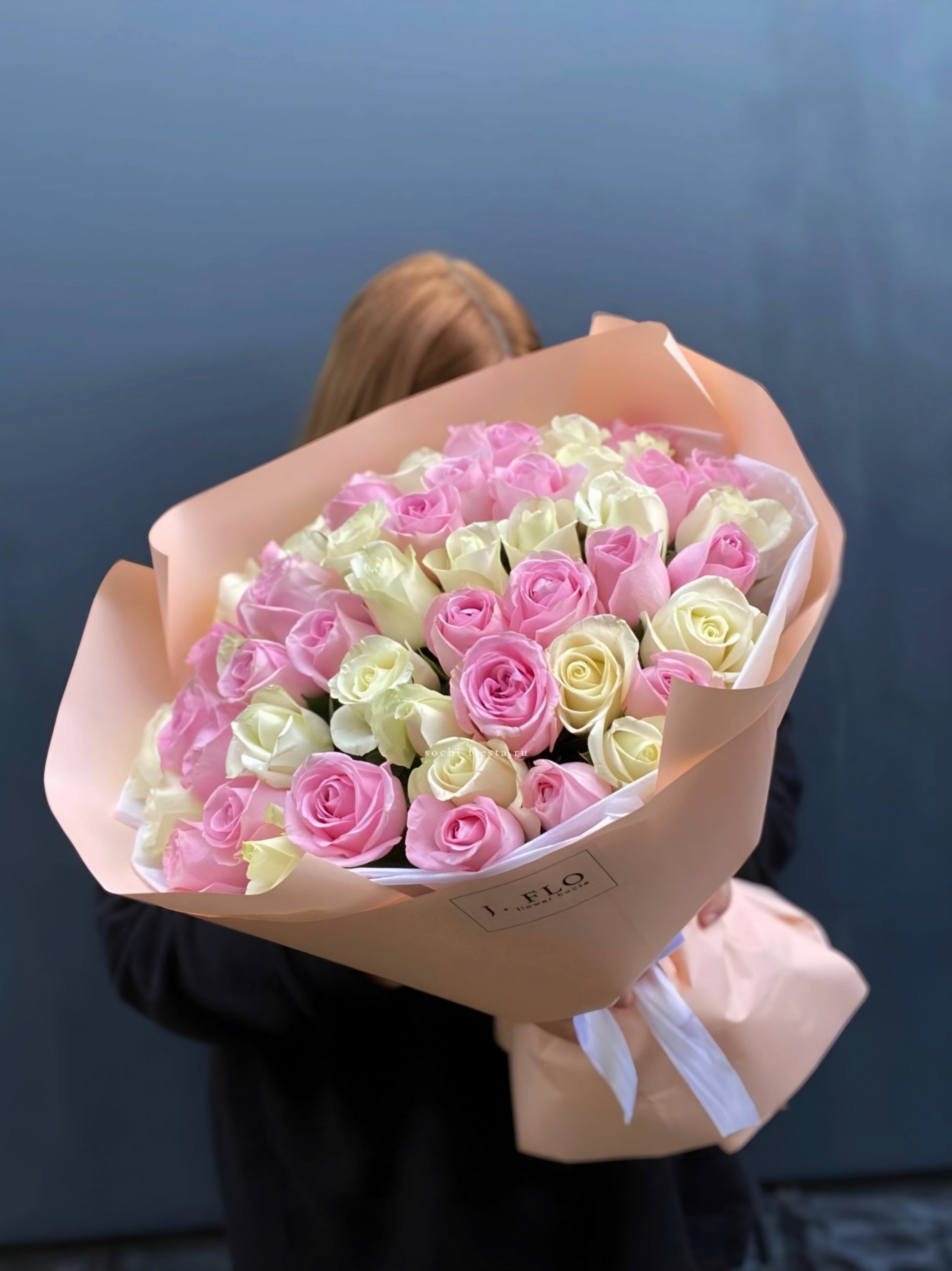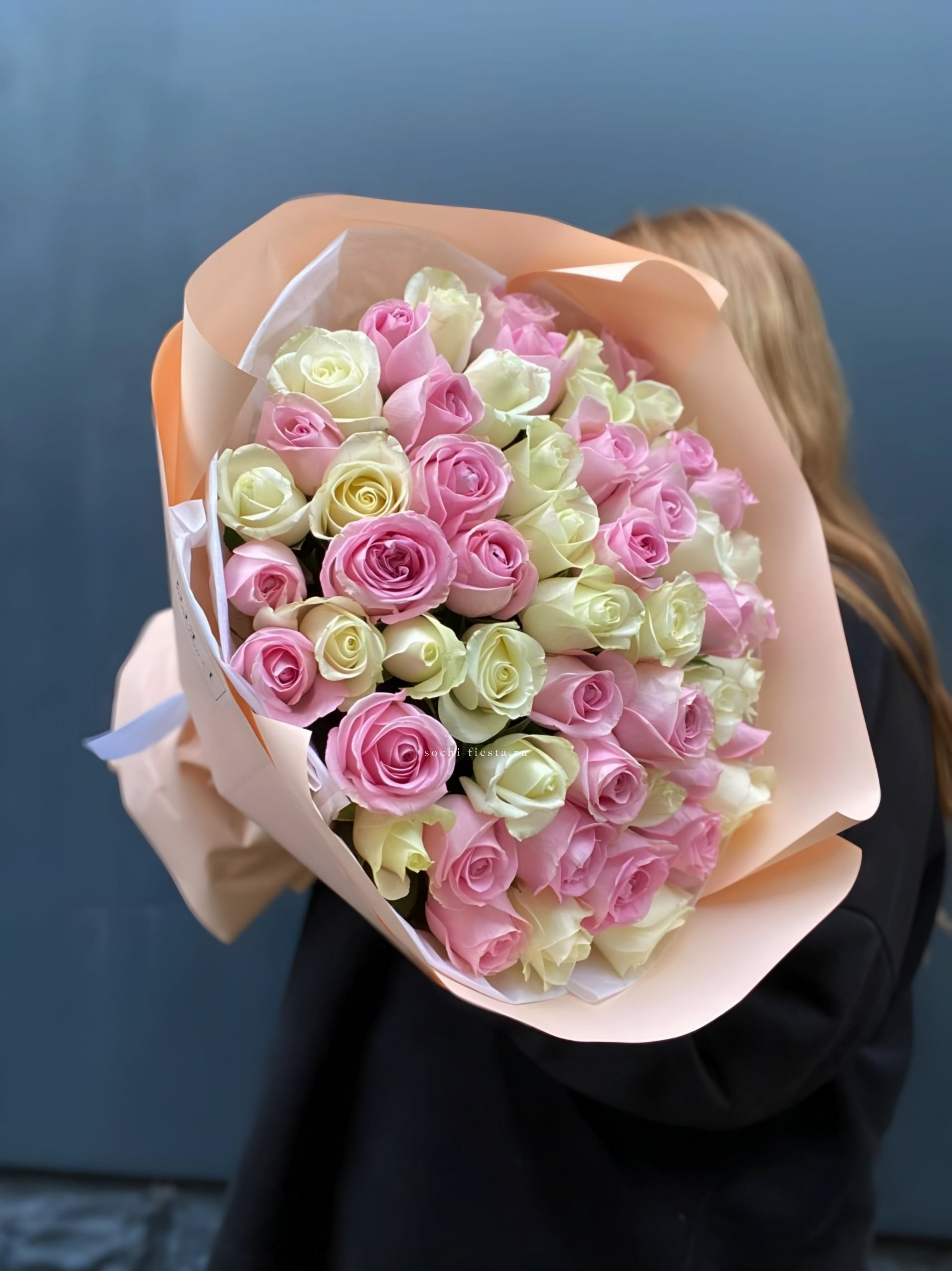 Пятьдесят пять роз переплетают белый и розовый в мягкую градацию без четких границ. Букет дышит светом и воздухом, а его объем позволяет рассмотреть каждый бутон отдельно.