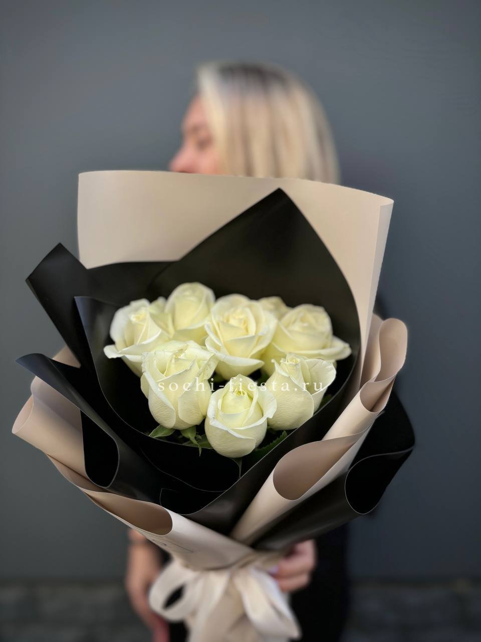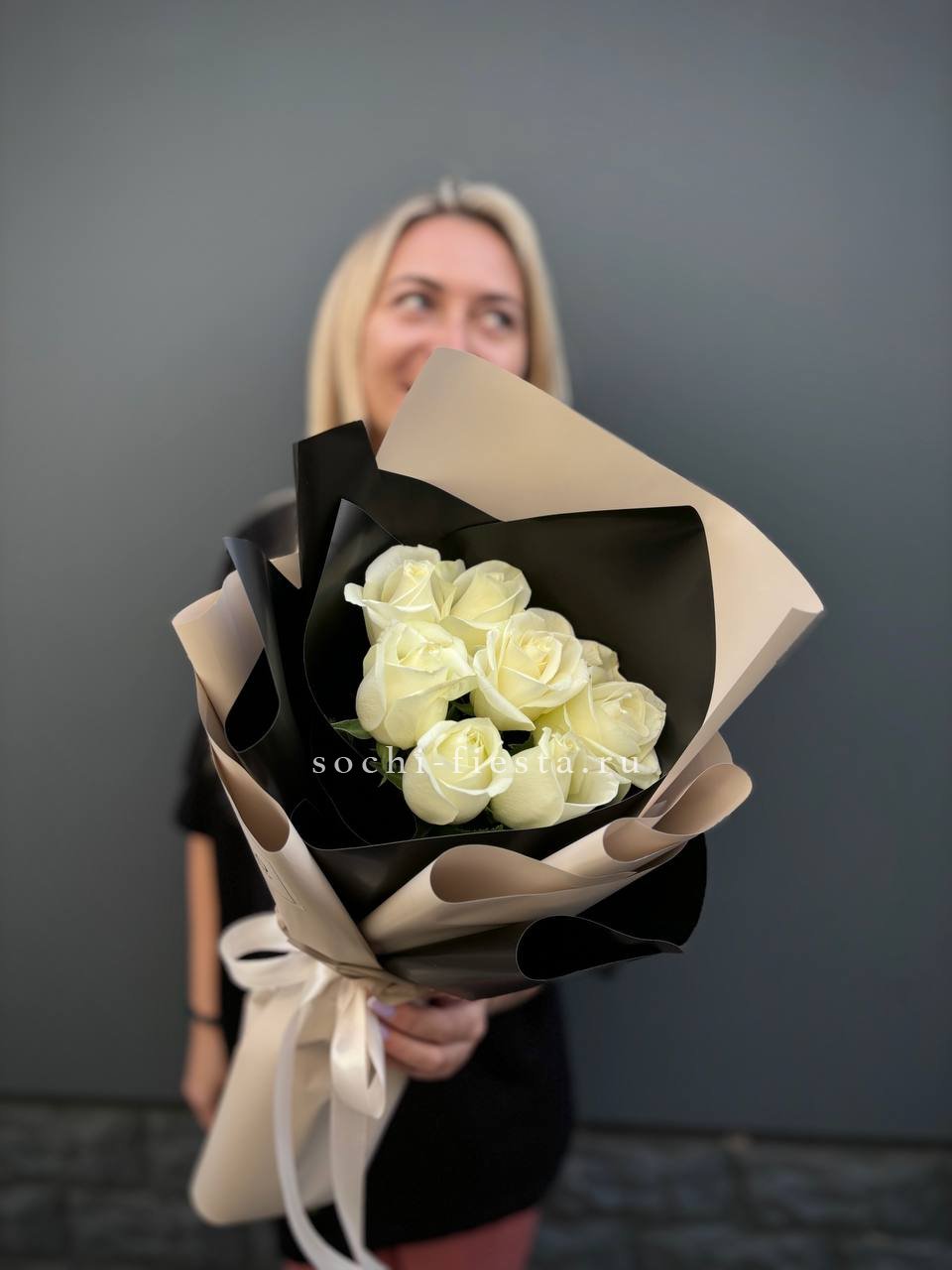 Пятнадцать белых роз в упаковке кофейного оттенка создают спокойное сочетание света и теплой глубины. Лаконичная форма букета удобна для вручения и дальнейшего размещения.