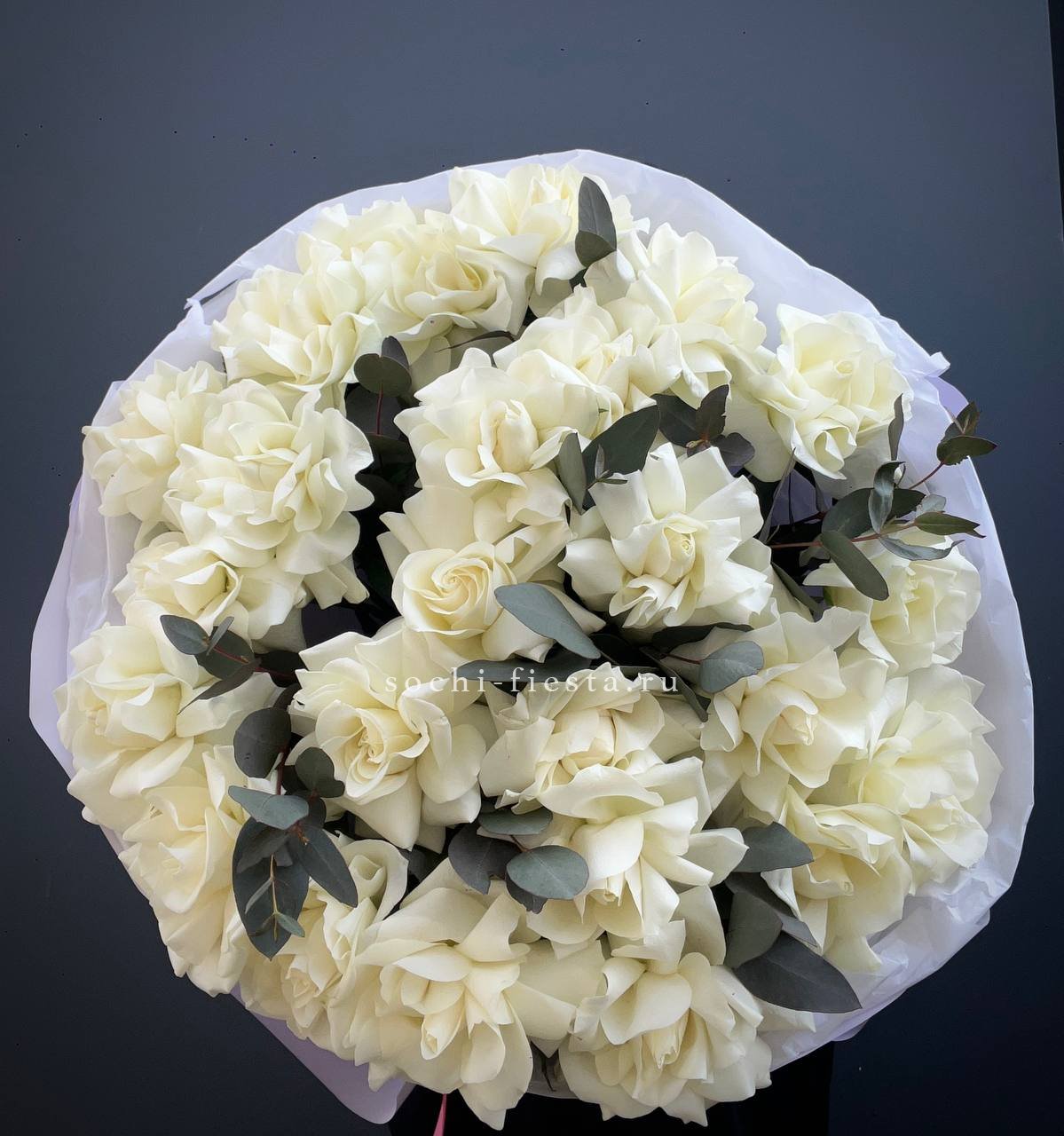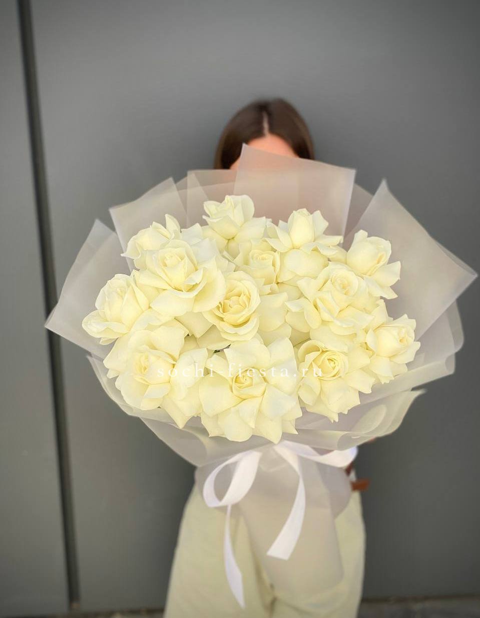 15 белых роз, лента, оформление фоамиран.