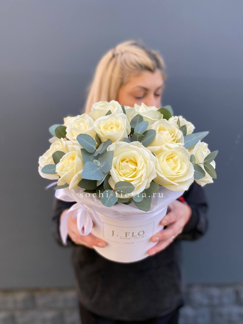 Пятнадцать белоснежных роз собраны в аккуратную форму с ровным силуэтом. Композиция сохраняет свежесть и держит структуру благодаря продуманному размещению бутонов в цилиндре.
