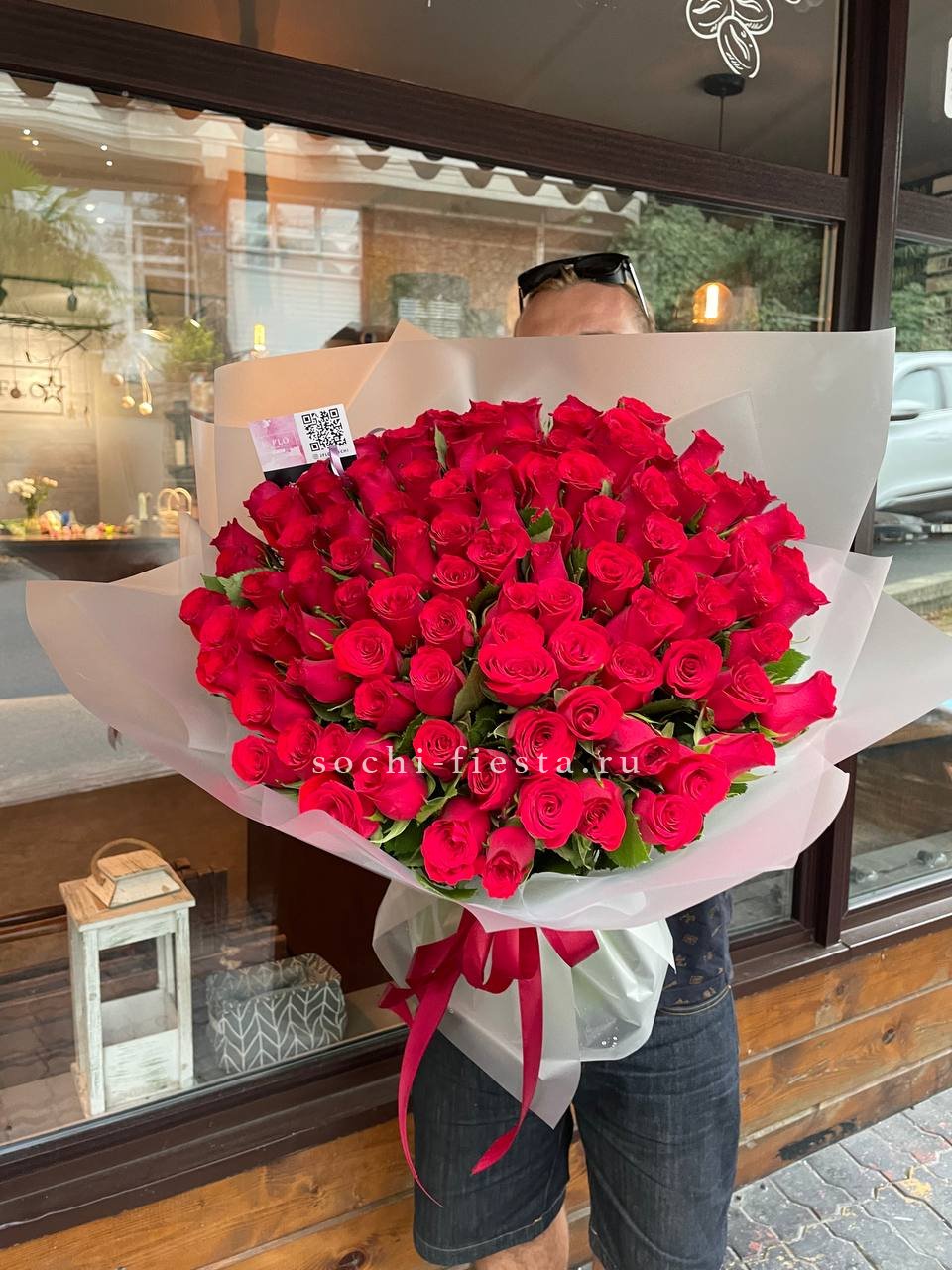 Сто один бутон сорта Лолита раскрывается бархатными лепестками глубокого красного цвета. Высокие стебли формируют объемную композицию с выразительным силуэтом. Классика в современной подаче.