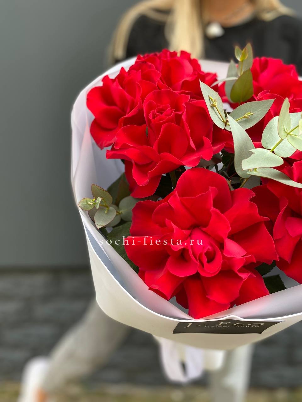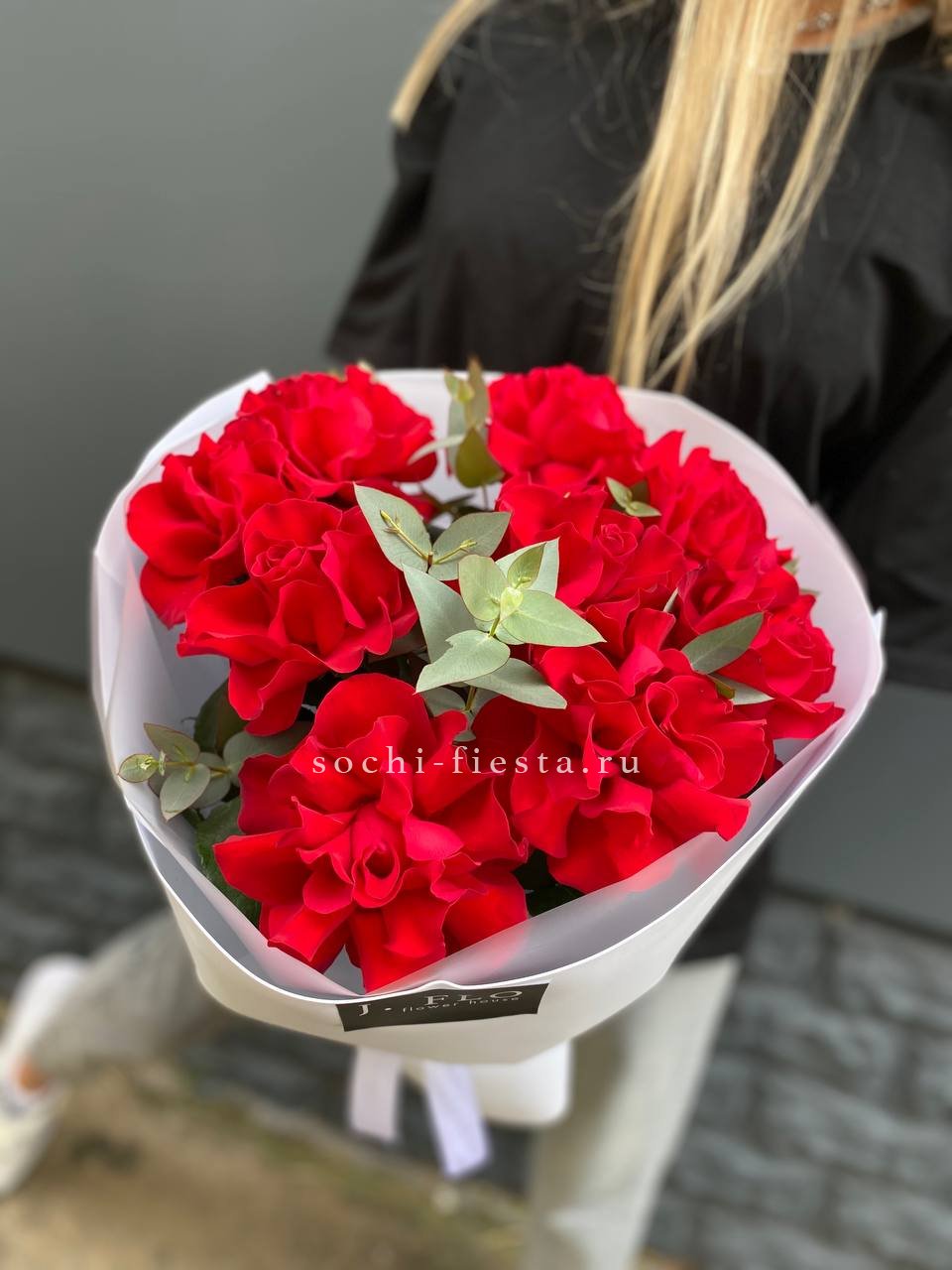 Красные розы образуют rounded форму с равномерным распределением бутонов. Фоамиран добавляет мягкую текстуру по краю, создавая завершенную композицию для яркого жеста.
