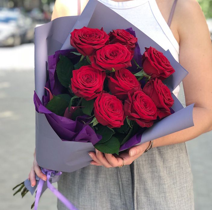Девять роз глубокого красного цвета в комбинированной обёртке. Бутоны с плотной текстурой лепестков создают яркое визуальное присутствие и долго сохраняют свежесть.