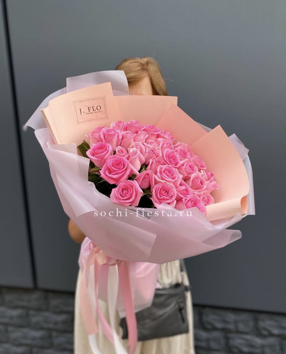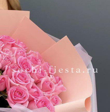 роза розовая - 101 шт., лента, белая дизайнерская бумага.