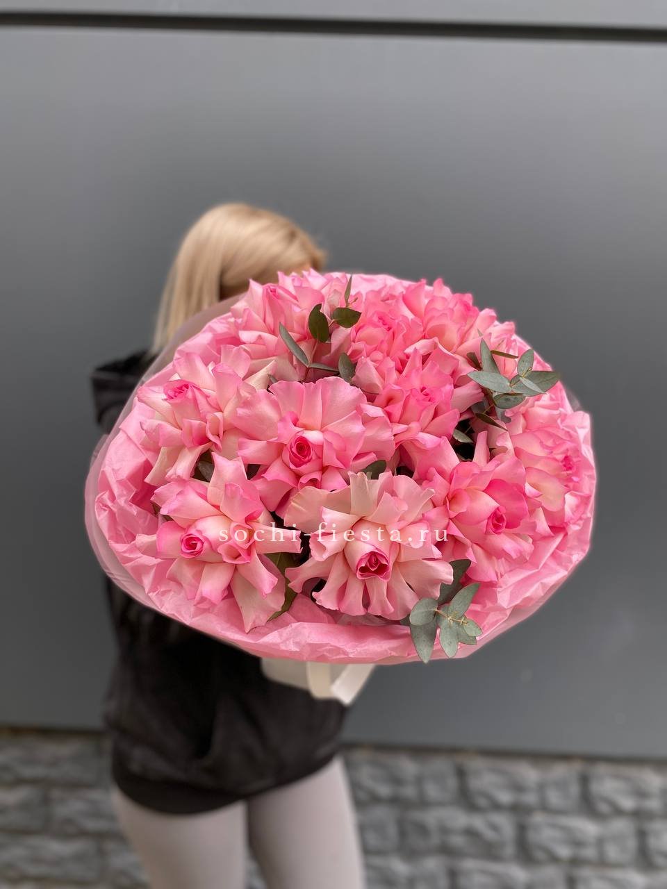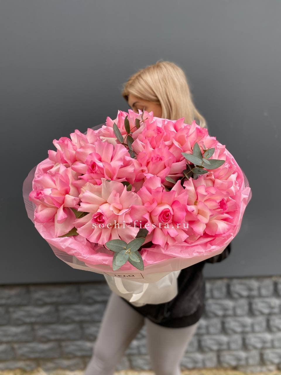 Тридцать одна роза образует пышное облако розового цвета с серебристыми нотами эвкалипта. Крафтовая обертка подчёркивает естественную красоту бутонов и создаёт ощущение лёгкости.