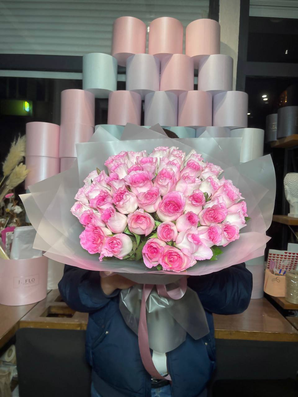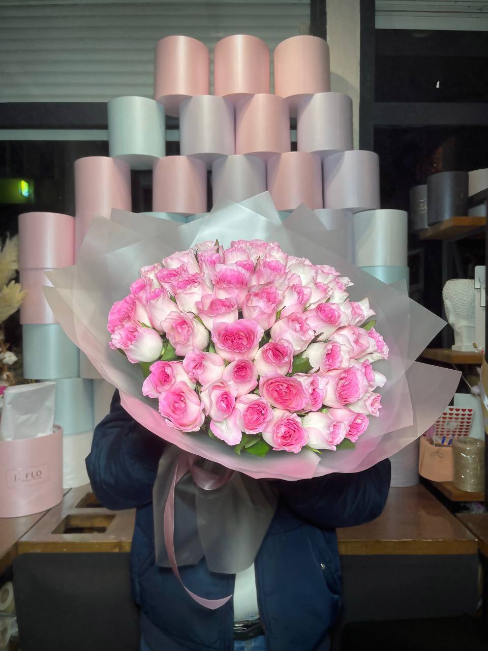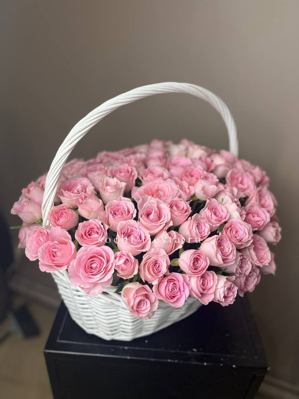 Пятьсот один бутон в корзине — это объем, который заполняет собой все вокруг. Розовый цвет разворачивается волнами, создавая почти скульптурное присутствие в интерьере.