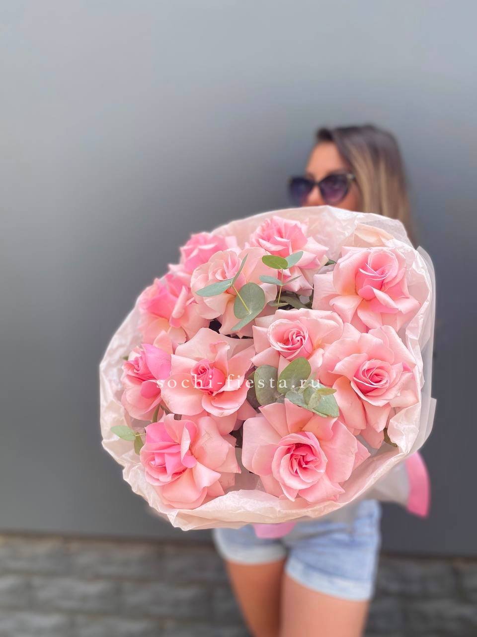 Одиннадцать вывернутых роз с открытой сердцевиной притягивают взгляд игрой света на лепестках. Авторская упаковка и веточка эвкалипта завершают композицию.