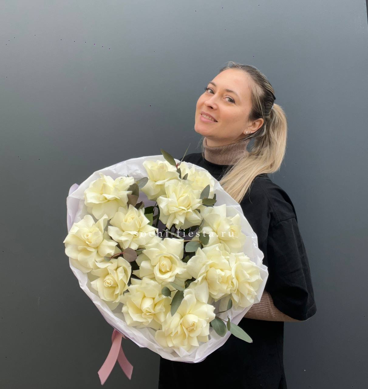 Тринадцать вывернутых французских роз сочетаются с серебристым эвкалиптом. Белые головки с волнистыми лепестками образуют воздушное облако.