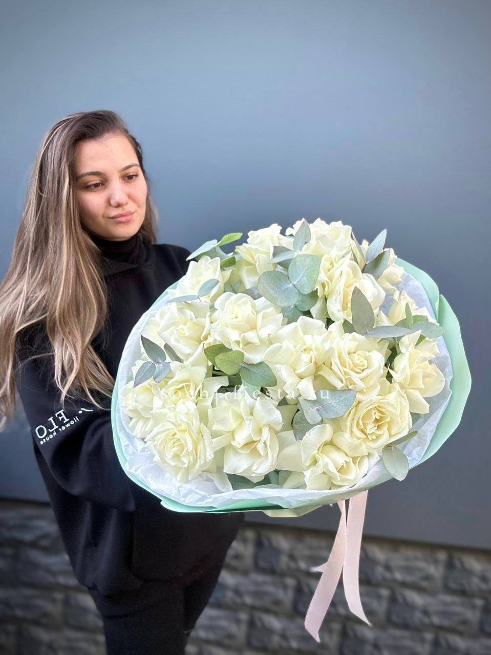 Девятнадцать вывернутых роз собраны в плотный букет, где каждый бутон развернут наружу и демонстрирует сложную структуру лепестков. Белый цвет звучит чисто и уверенно.
