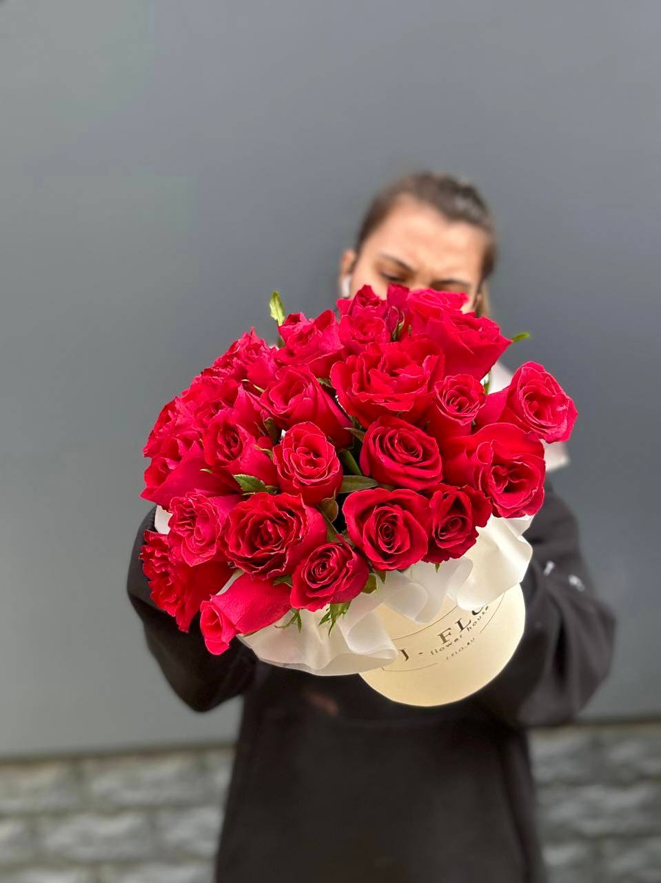 Двадцать семь бутонов плотно собраны в круглой коробке и создают объёмную цветочную шапку. Кенийские розы держат форму долго и раскрываются постепенно.