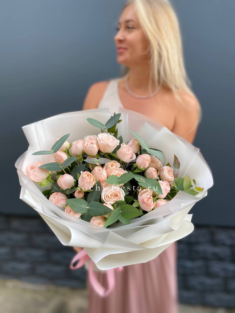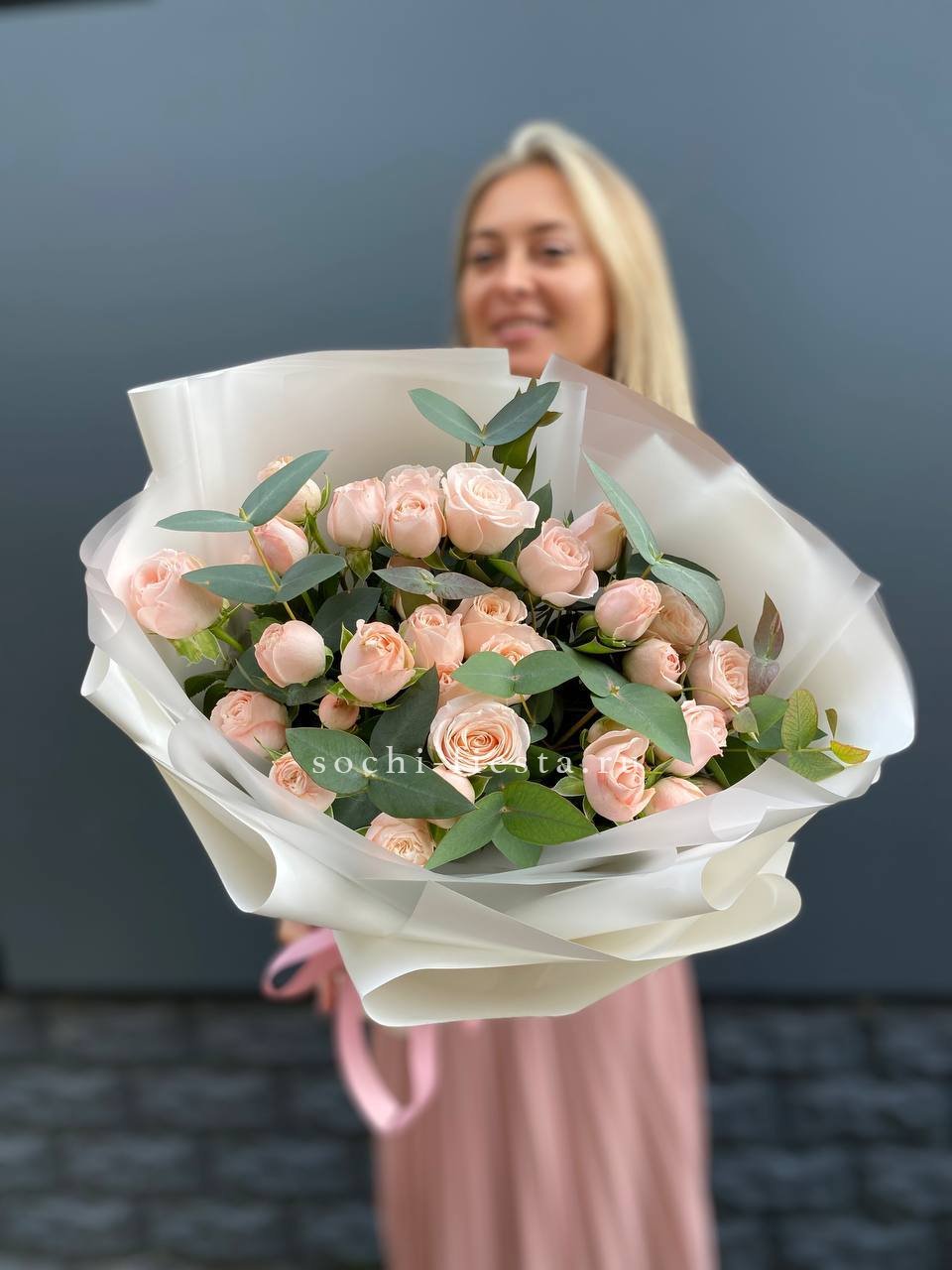 кустовая роза - 19 шт., эвкалипт, лента, дизайнерская упаковка.