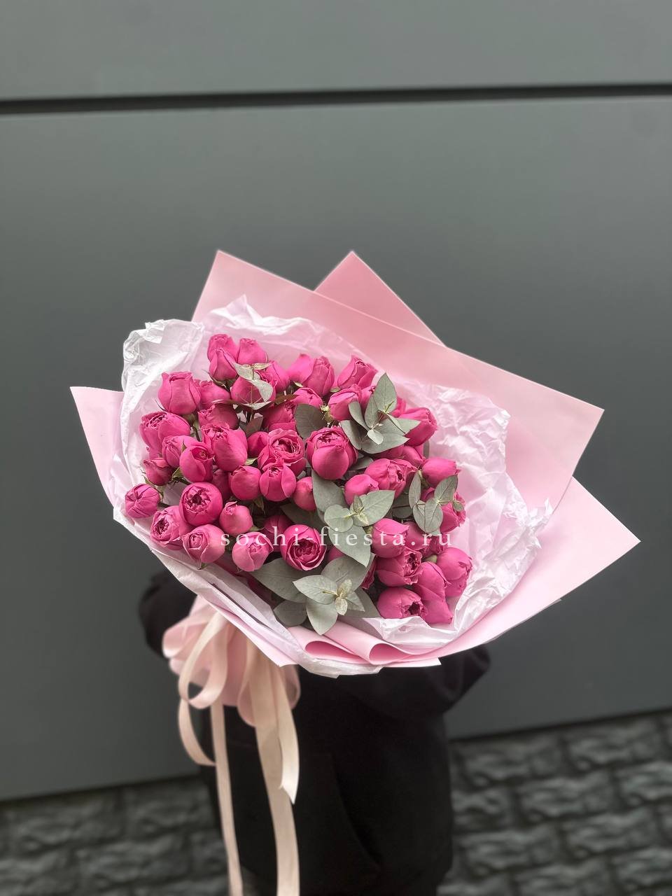 Двадцать пять веток кустовой розы в лавандово-сиреневой палитре собраны в округлую форму. Многочисленные бутоны разной степени раскрытия добавляют динамику и объём.