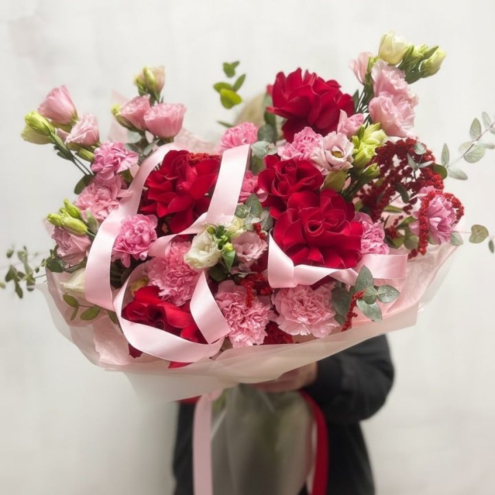 Основа сборных букетов в Чебоксарах: розы (Freedom, Mondial, Avalanche), хризантема кустовая, альстромерия, эустома, фрезия, вероника. Дополнительно — ранункулюсы в сезон, хризантема одиночная, ирис весной, тюльпаны в апреле. Состав зависит от текущей поставки и сезона. Флорист всегда предлагает то, что в лучшей форме прямо сейчас.