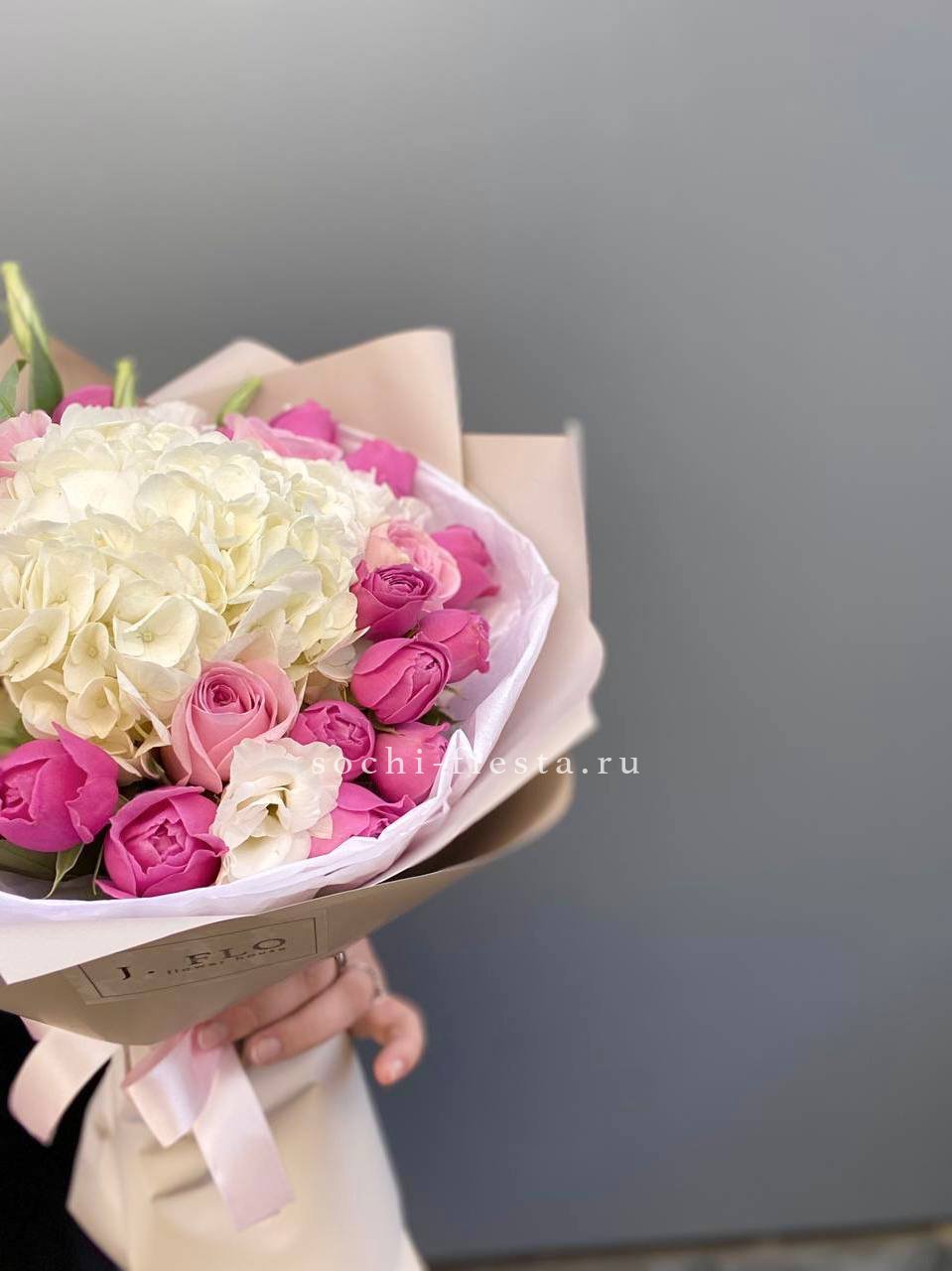 гортензия белая, роза одноголовая, роза кустовая, пионовидная роза Мисти Баблс, эустома тишью, упаковка, лента.