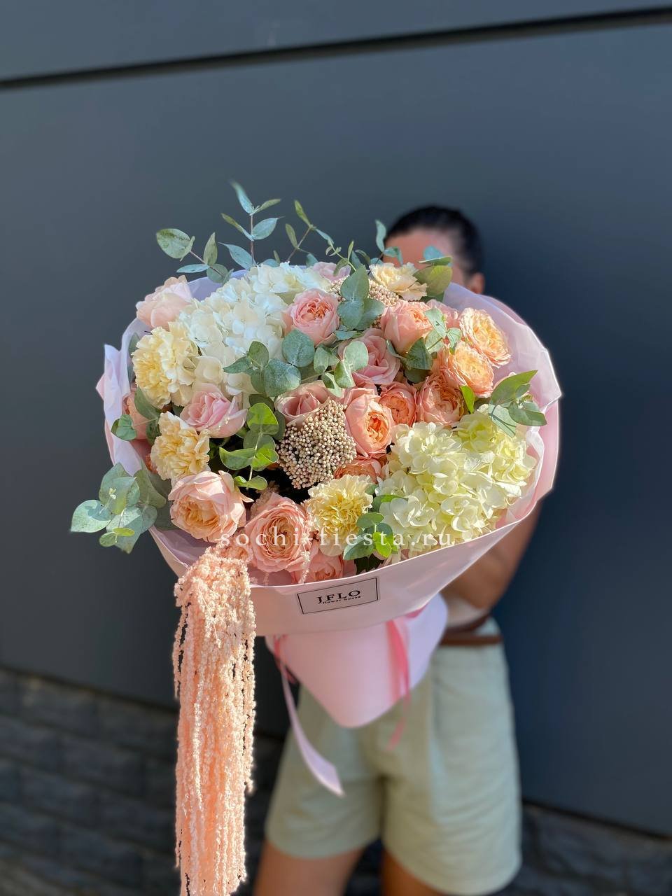 Пышная композиция с розами Джульетта раскрывается крупными бутонами и многослойной фактурой. Амарант и озатамус создают глубину, а гортензия завершает форму мягкими соцветиями.