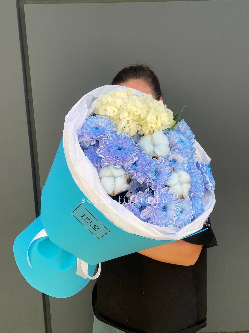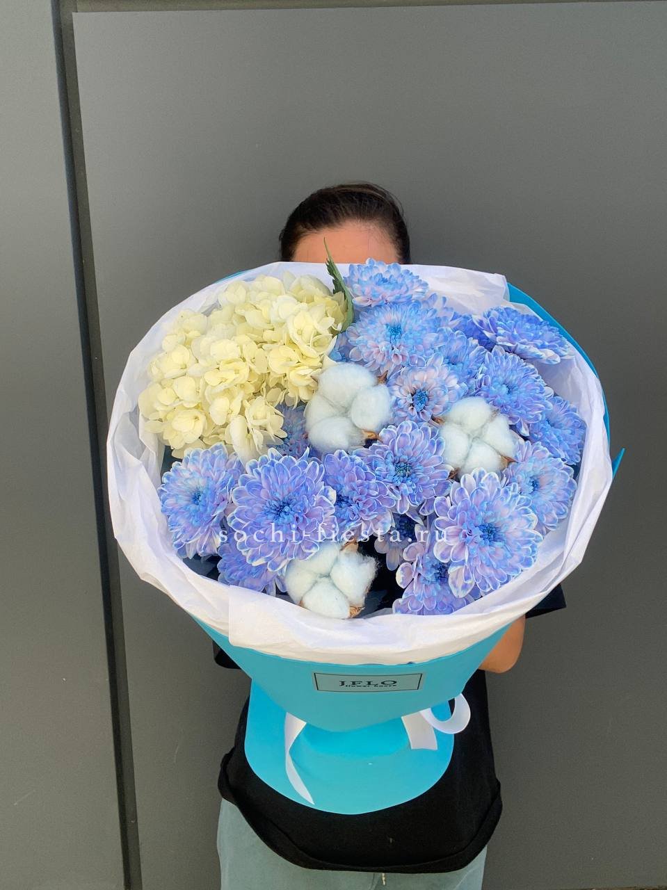 герберы, хризантемы, статица (аналог), диантусы, хлопок, упаковка.