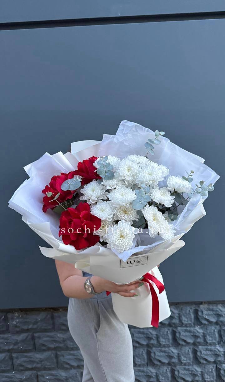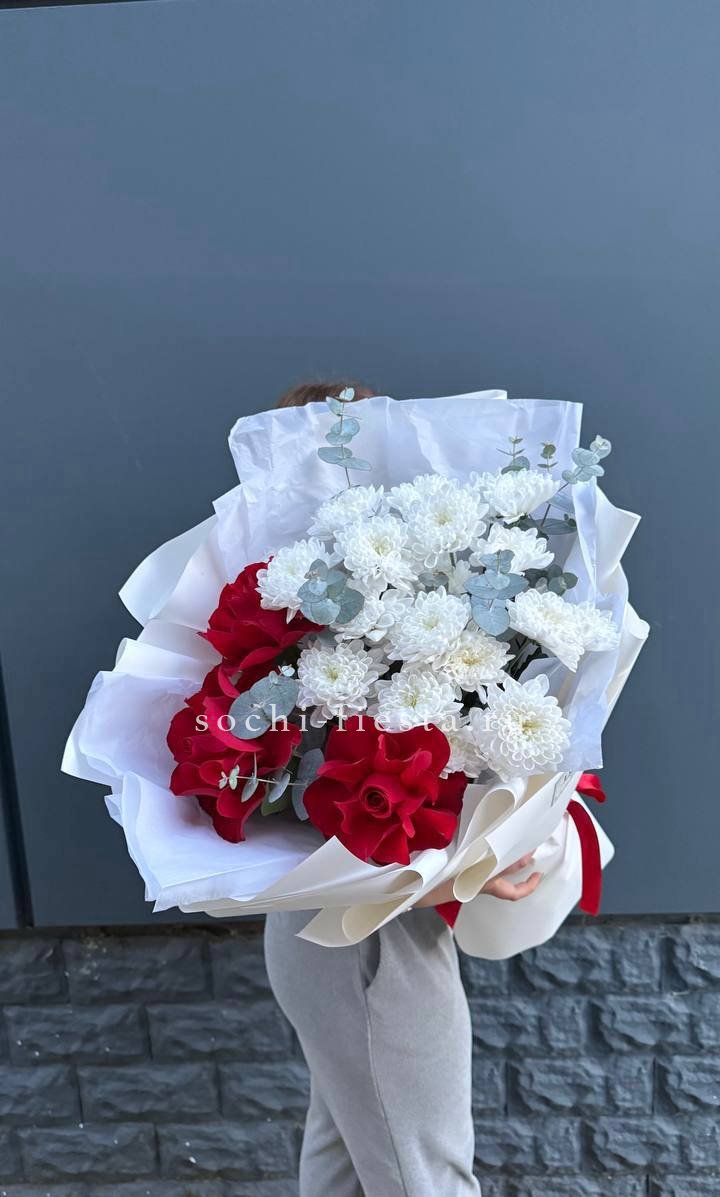Белые розы и эустома образуют воздушный объем, где каждый бутон дышит свободно. Диантус добавляет графичности, а эвкалипт создает прохладную дымку по краям. Букет для тех, кто ценит легкость и современную флористику.