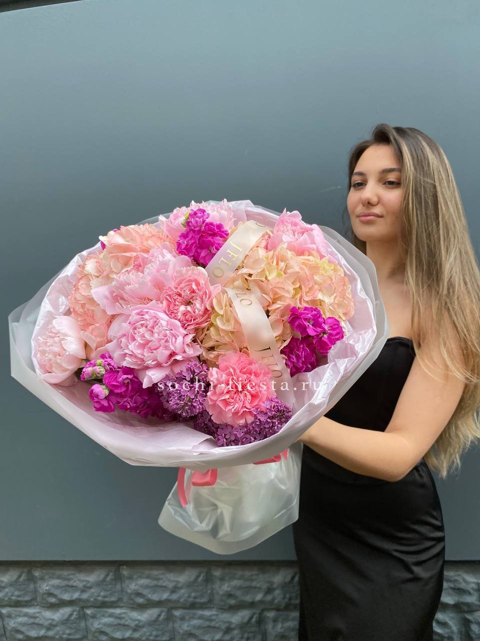 пионы, гортензии, диантусы, маттиола лента и дизайнерская пленка.