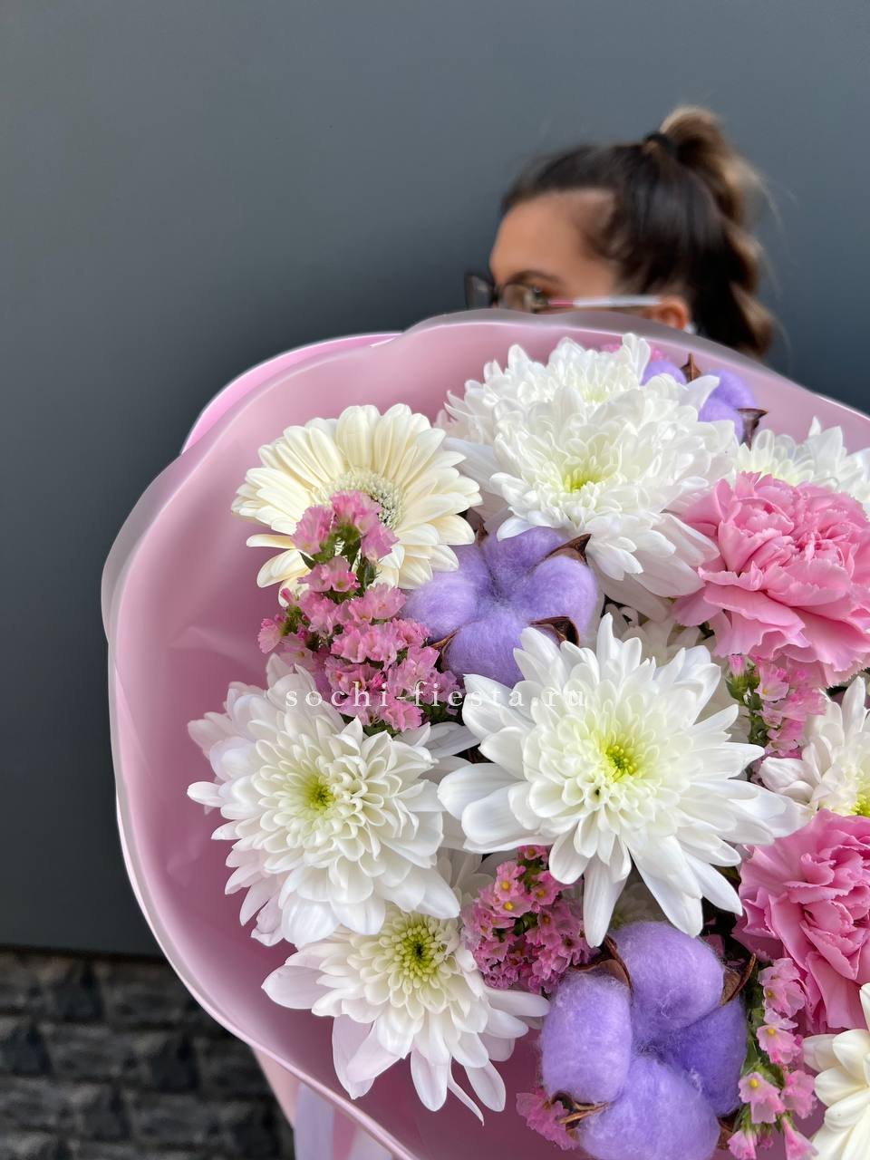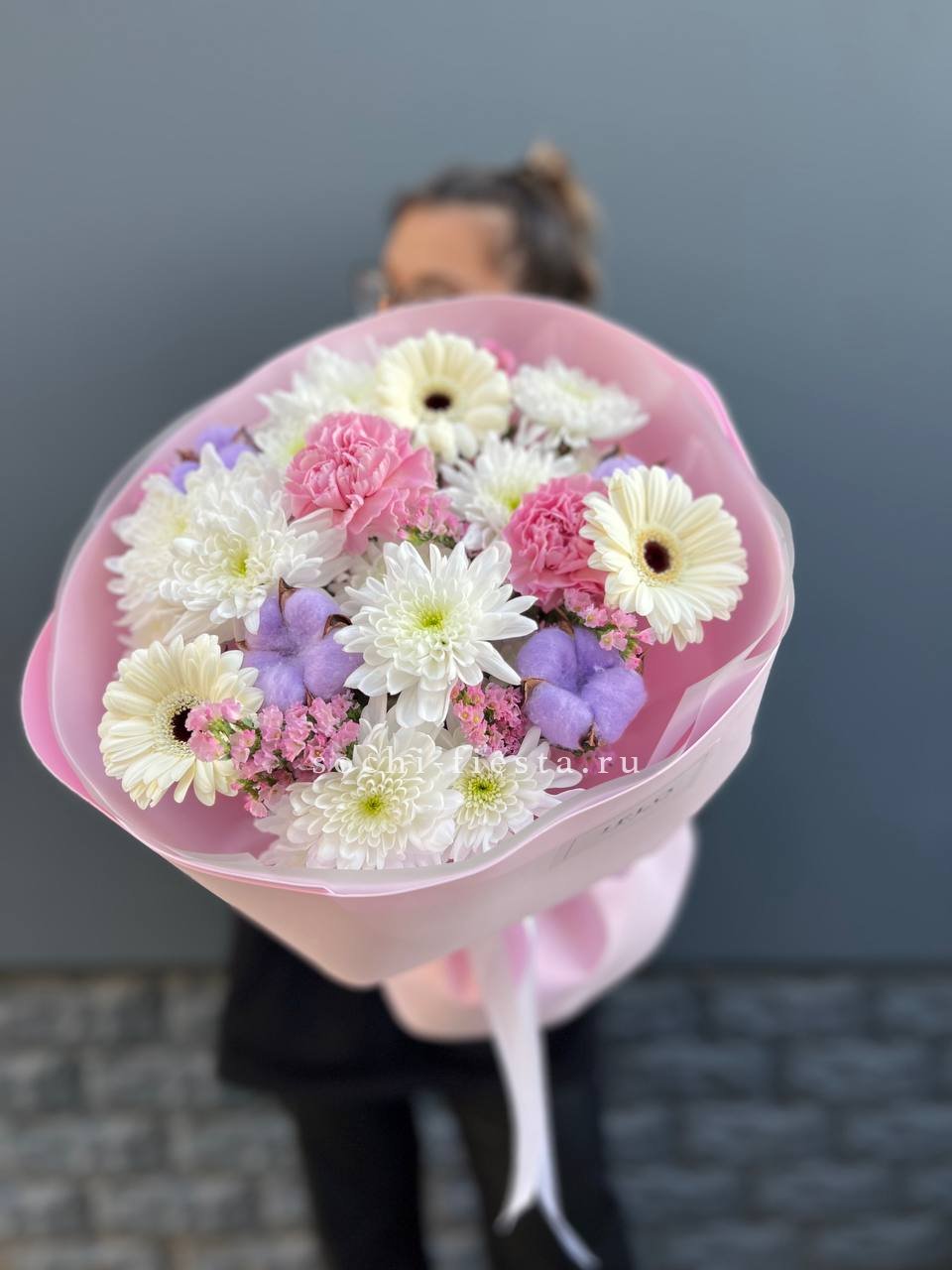 Состав букета: роза кустовая, хризантемы, озотамнус, диантус,  матрикария, упаковка, лента.