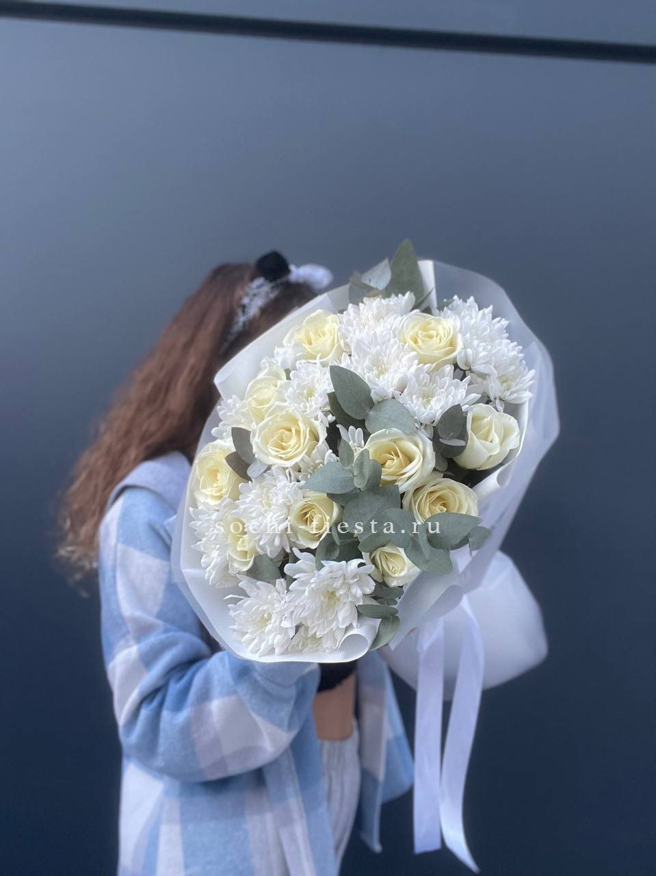Розы и диантусы образуют лёгкий микс с выразительной игрой фактур. Эвкалипт добавляет графичности и свежести общей картине. Компактная сборка удобна для размещения на столе или комоде.