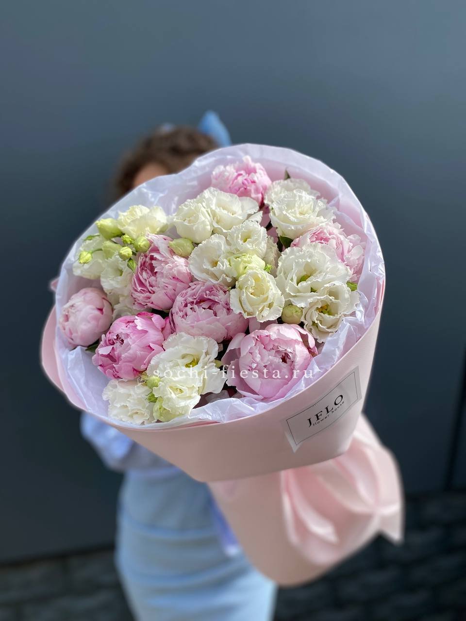 Пионы и эустома собраны в плотную округлую форму с выразительной текстурой лепестков. Белые и розовые оттенки создают мягкий переход без резких границ.