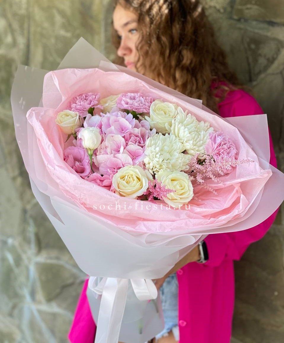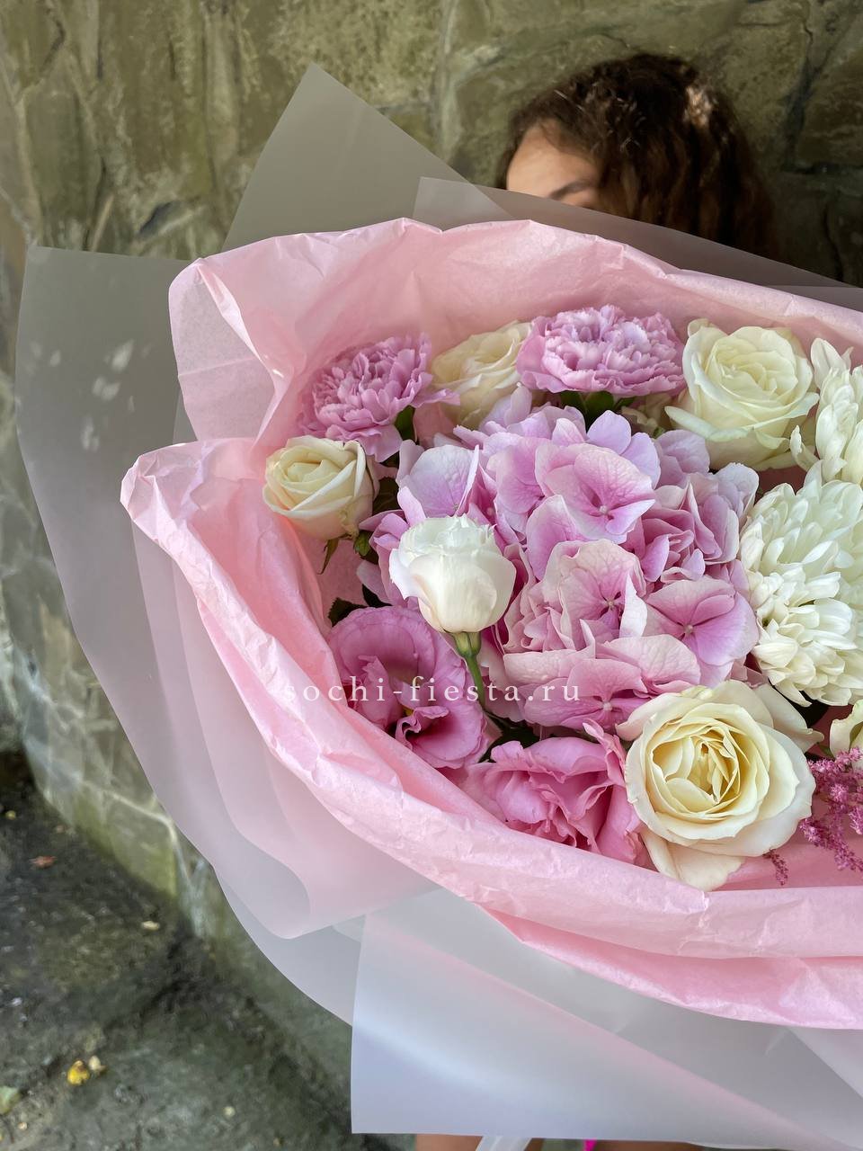 гортензия, хризантема, роза, эустома, упаковка, лента.