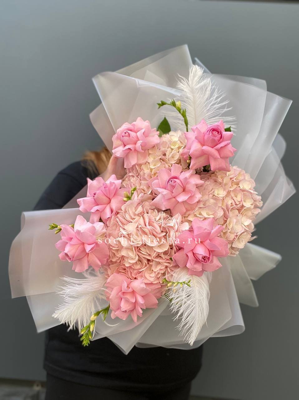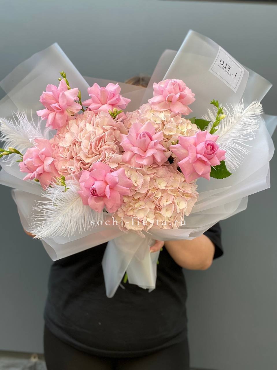 гортензия, бомбастик, диантусы, эвкалипт, антиринум, хризантема, пленка.