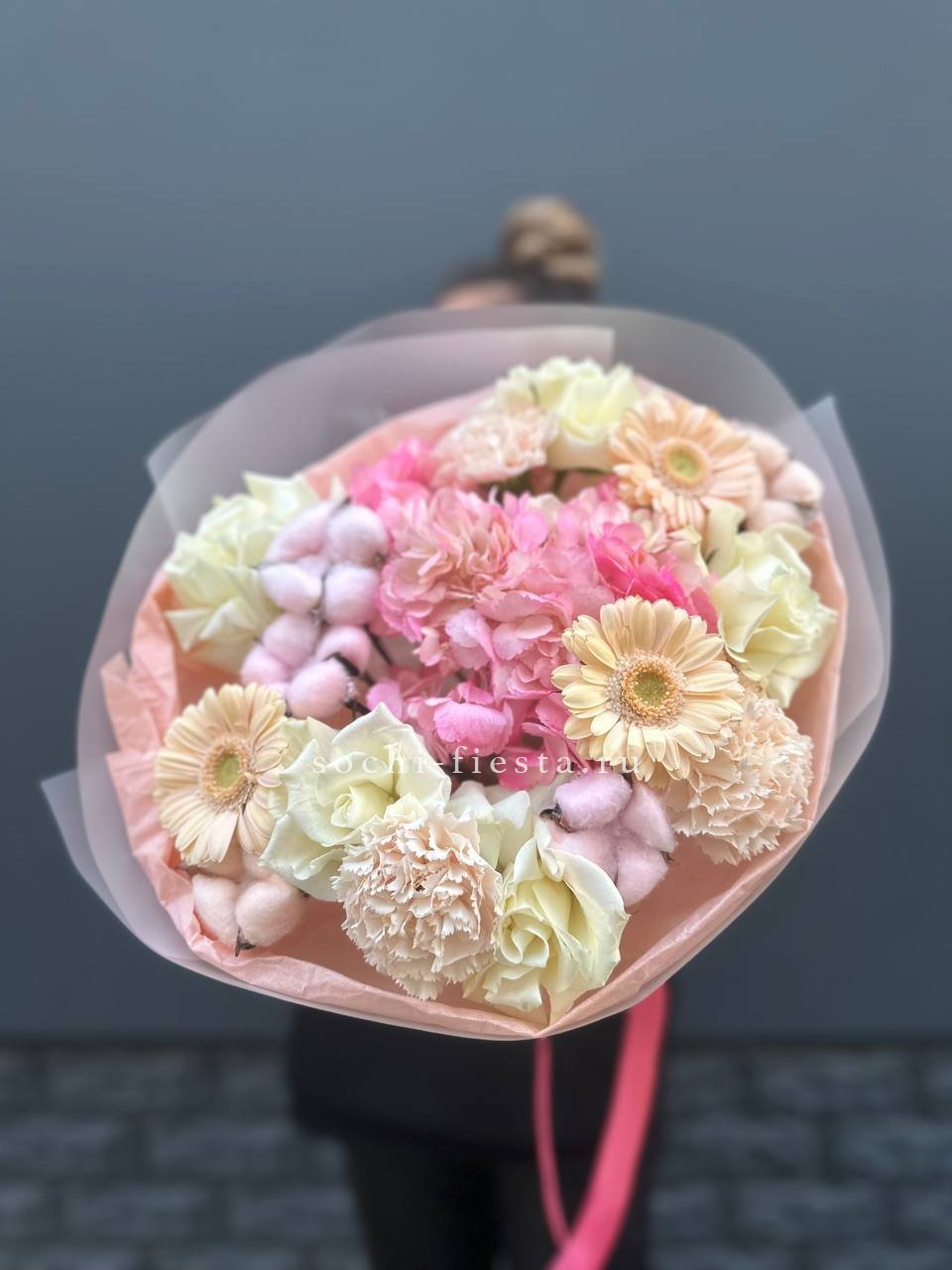 гортензия, герберы, розы, диантусы, хлопок,  авторское оформление.