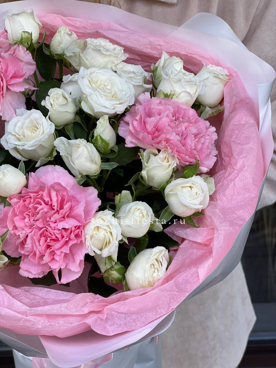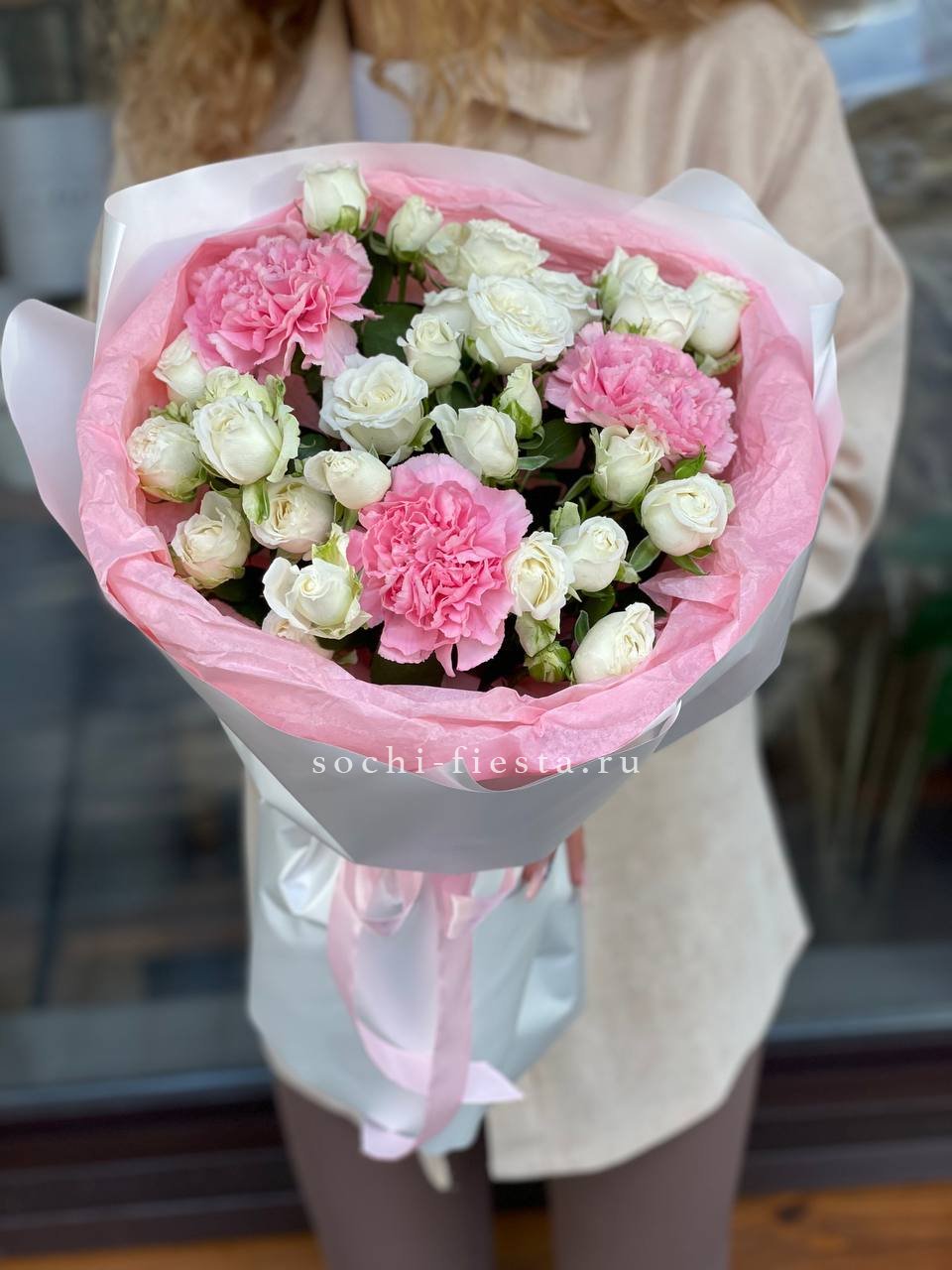 роза кустовая, диантус, лента, дизайнерская упаковка.