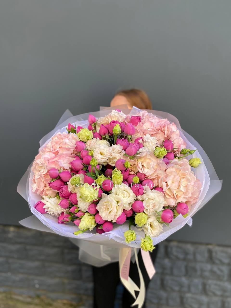 Мягкие пионовидные формы переплетаются с классическими розовыми бутонами в плотной округлой композиции. Эвкалипт освежает палитру и придаёт букету завершённость.