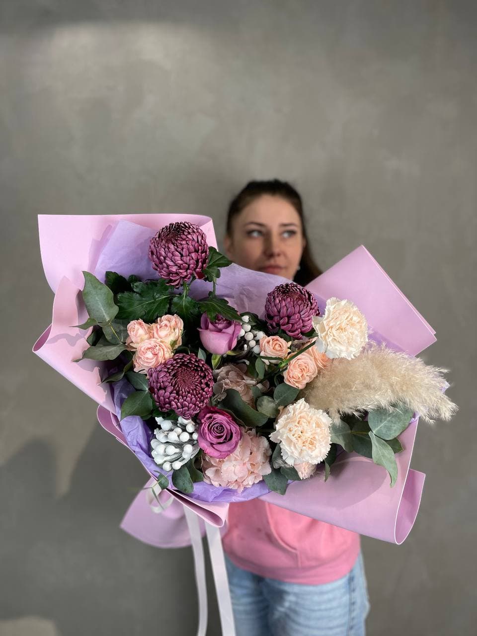 Пампас и эвкалипт задают направление всей композиции, вытягивая силуэт вверх. Гортензия и пионовидные розы создают округлую основу, а бруния добавляет графичные точки. Букет читается как единая динамичная форма.