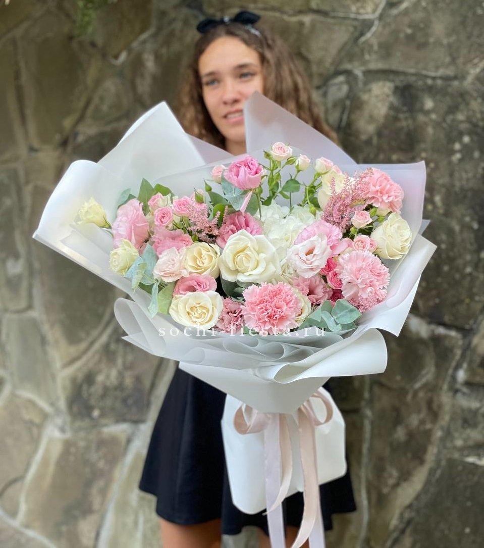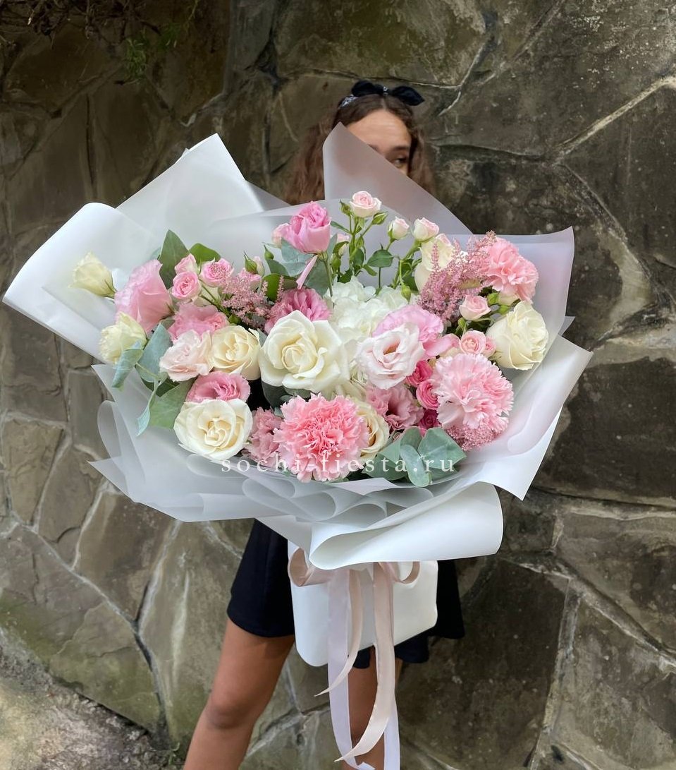 гортензия, диантус, кустовая пионовидная роза, эустома, вспомогательные цветы, эвкалипт, лента, дизайнерская упаковка.