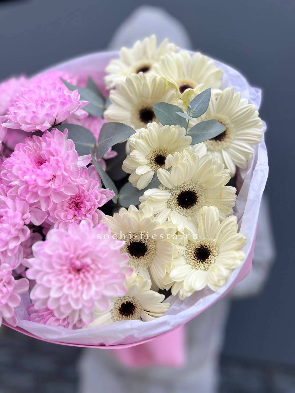 Солнечные герберы встречаются с пушистыми шапками хризантем в динамичной композиции. Веточки эвкалипта обрамляют цветы мягким зелёным контуром и придают свежесть.
