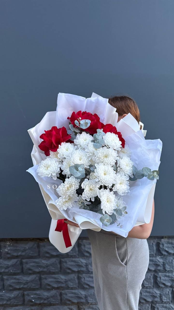 Красные розы и кустовая хризантема складываются в плотный ритмичный букет. Эвкалипт смягчает линии, а воздушная упаковка подчёркивает естественность формы.